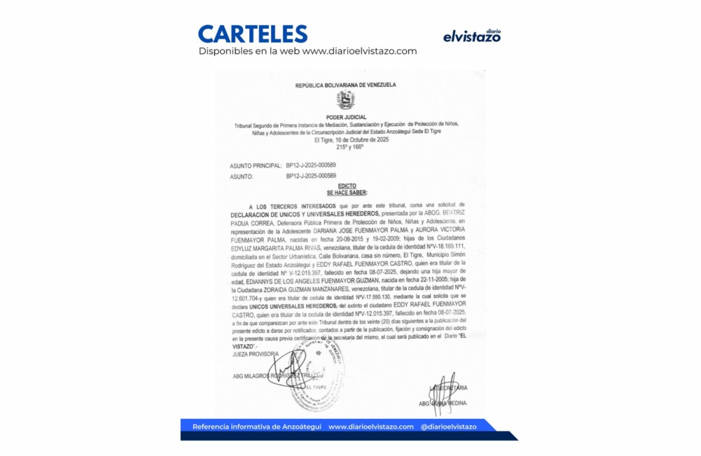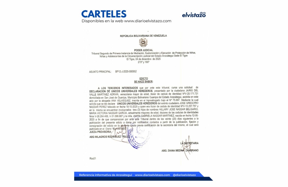 El Juzgado Segundo de Primera Instancia en lo Civil, Mercantil y Tránsito de la Circunscripción Judicial del Estado Anzoátegui, de El Tigre, dirigido por la jueza Dorilma Pinto Perales, emitió un Edicto de fecha 6 de marzo de 2024, en atención a Anny del Valle Flores Vargas, y todas aquellas personas que se crean con derechos sobre el inmueble ubicado en el Conjunto Residencial «Alameda» situado en la intersección de la carretera El Tigre, Ciudad Bolívar, y la carretera VEA de la ciudad de El Tigre, Estado Anzoátegui (hoy avenida Jesús Subero), cuya parcela se encuentra distinguida con el Nro. 16 de la calle B, en plano de parcelamiento, constante de una superficie de 372 metros cuadrados. Asunto: Demanda por prescripción adquisitiva contra el ciudadano C.I. N° 8.402.244, Jesús Antonio Vásquez, quien en vida fuera venezolano, C.I. N° V – 4.620.889.