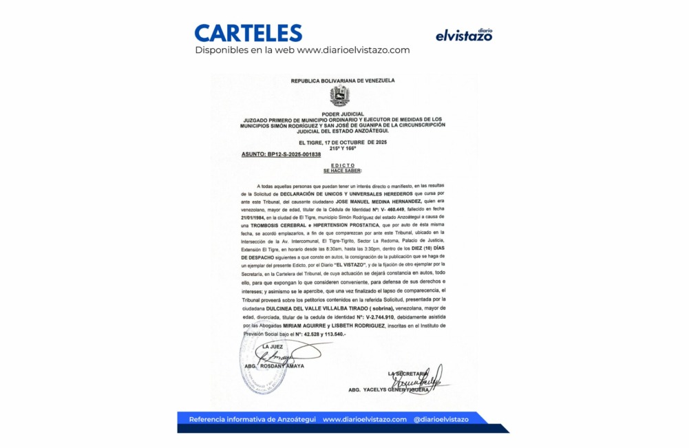 El Tribunal Segundo de Primera instancia de Mediación, Sustanciación y Ejecución de Protección de Niños, Niñas y Adolescentes de la Circunscripción Judicial del estado Anzoátegui, sede El Tigre, dirigido por la jueza Milagros Rodríguez Trillo, emitió un Edicto de fecha 17 de enero de 2025 en atención al ciudadano Luis Alexander Márquez Forero, venezolano, titular de la cédula de identidad N° V-19.288.677, que por ante este tribunal cursa una demanda de Privación de Patria Potestad presentada por la ciudadana Rusbelys Medina Carreño, venezolana, titular de la cédula de identidad N° V-18.455.993.