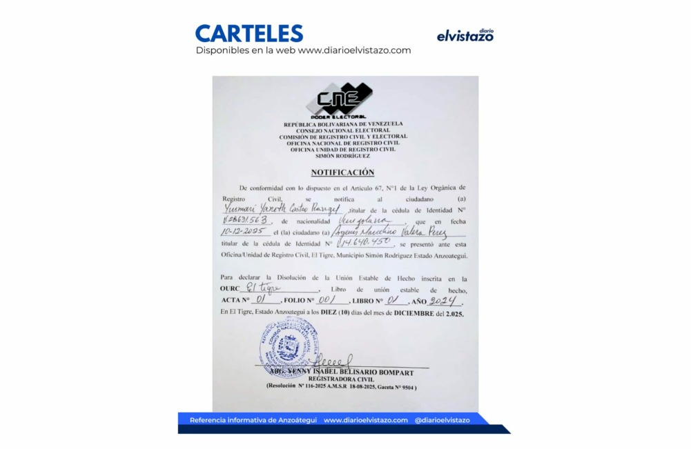 El Instituto Nacional de Tierras, JT El Tigre, estado Anzoátegui, emitió un cartel de notificación de fecha 7 de julio de 2025, en atención a Luis Antonio Moy Zamora, titular de la cédula de identidad N° V – 10.942.680 y el lote de terreno «Dios es Amor», sector Güico, parroquia Cantaura, municipio Pedro María Freites, estado Anzoátegui.