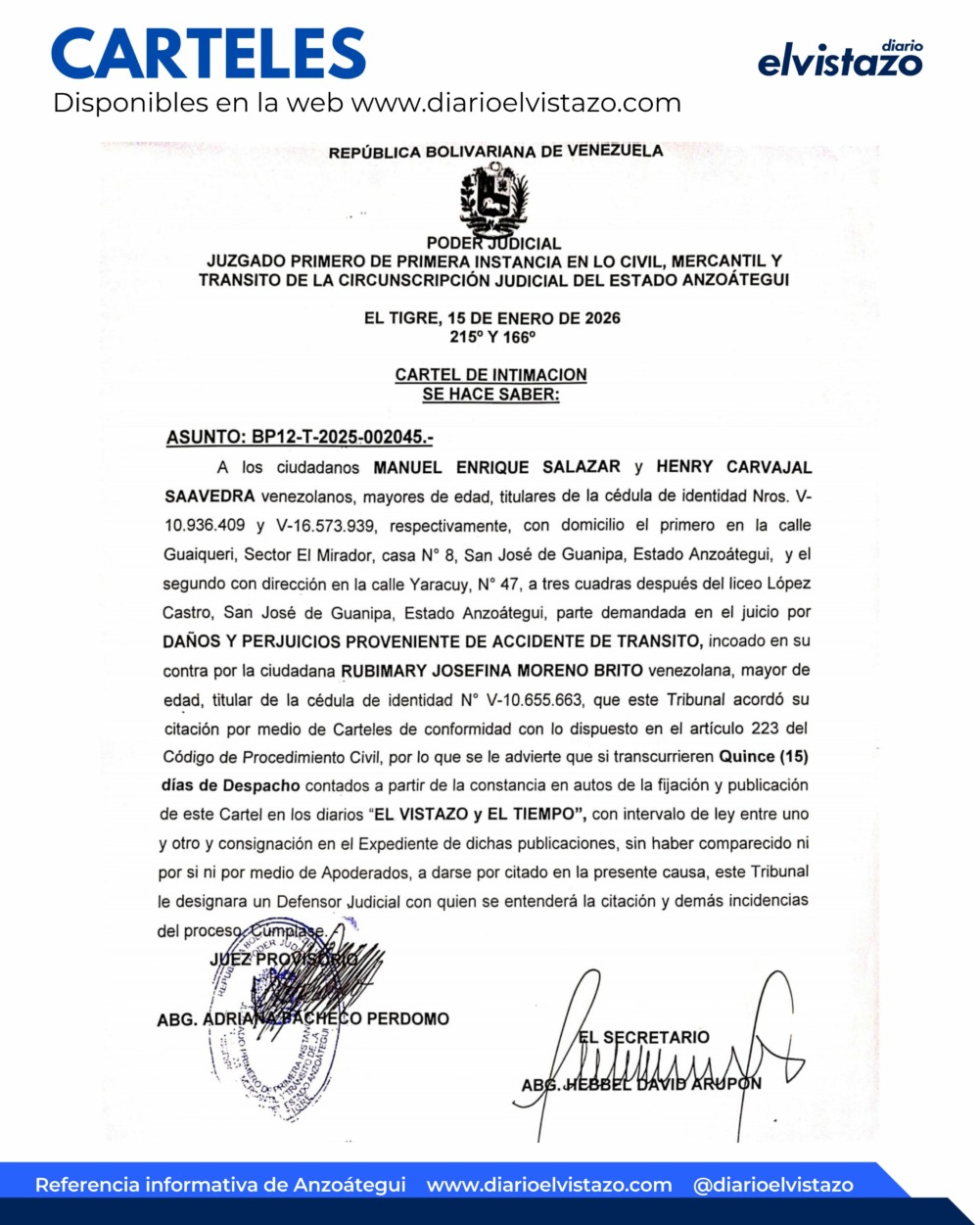 El Juzgado Primero de Primera instancia en lo Civil, Mercantil y Tránsito de la Circunscripción Judicial de El Tigre, estado estado Anzoátegui, dirigido por la juez Adriana Pacheco Perdomo, emitió un Cartel de Citación de fecha 15 de enero de 2026, en atención a los ciudadanos Manuel Enrique Salazar y Henry Carvajal Saavedra, venezolanos, mayores de edad, titulares de las cédulas de identidad V-10.936.409 y 16.573.939. Asunto: Juicio por Daños y Perjuicios provenientes de Accidente de Tránsito, incoado en su contra por la ciudadana Rubimary Josefina Moreno Brito, venezolana, mayor de edad, titular de la cédula de identidad N° V-10.655.663.