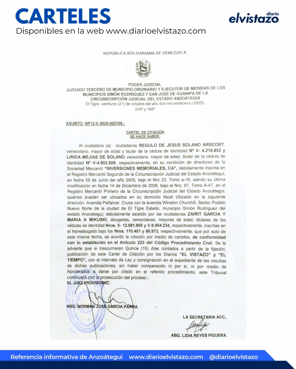 El Juzgado Tercero de Municipio Ordinario y Ejecutor de Medidas de los Municipios Simón Rodríguez y San José de Guanipa de la Circunscripción Judicial del estado Anzoátegui, dirigido por el juez Norman García Parra, emitió un Cartel de Citación de fecha 21 de octubre de 2025, en atención a los ciudadanos Régulo de Jesús Solano Arscort, venezolano, mayor de edad, cédula de identidad N° V-4.216.852 y Lirida Mejías de Solano, venezolana, mayor de edad, titular de la cédula de identidad N° V-4.902.509 en su condición de directores de la Sociedad Mercantil «Inversiones Memoriales C.A.».