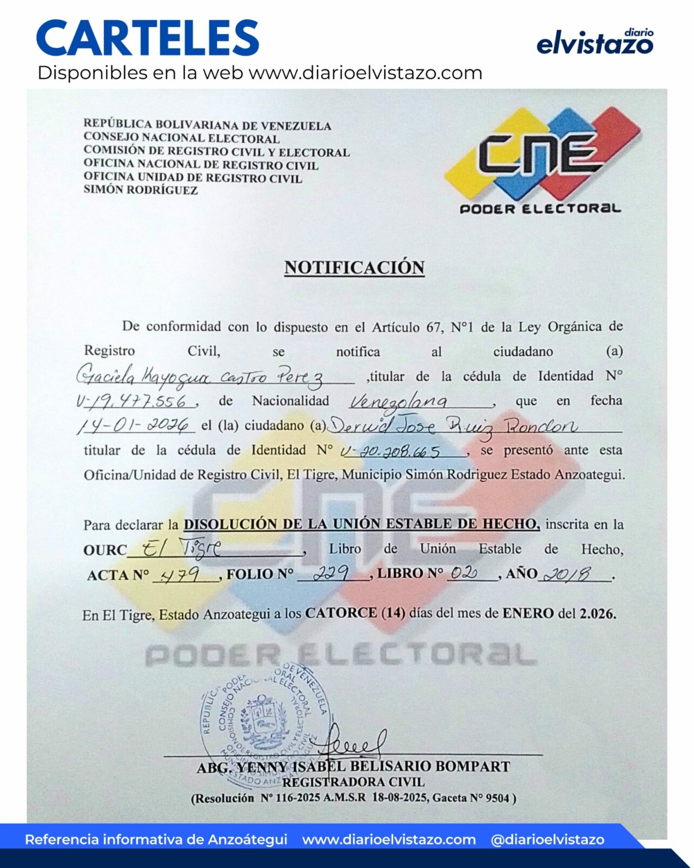 La Oficina Unidad de Registro Civil del municipio Simón Rodríguez dirigida por la Abg. Yenny Isabel Belisario Bompart, emitió una notificación de fecha 14 de Enero de 2026, en atención a los ciudadanos Graciela Castro Pérez, titular de la cédula de identidad N° V- 19.477.556 y Dervid Ruiz Rondón titular de la cédula de identidad N° V- 20.208.665. Asunto: Disolución de Unión Estable de Hecho.