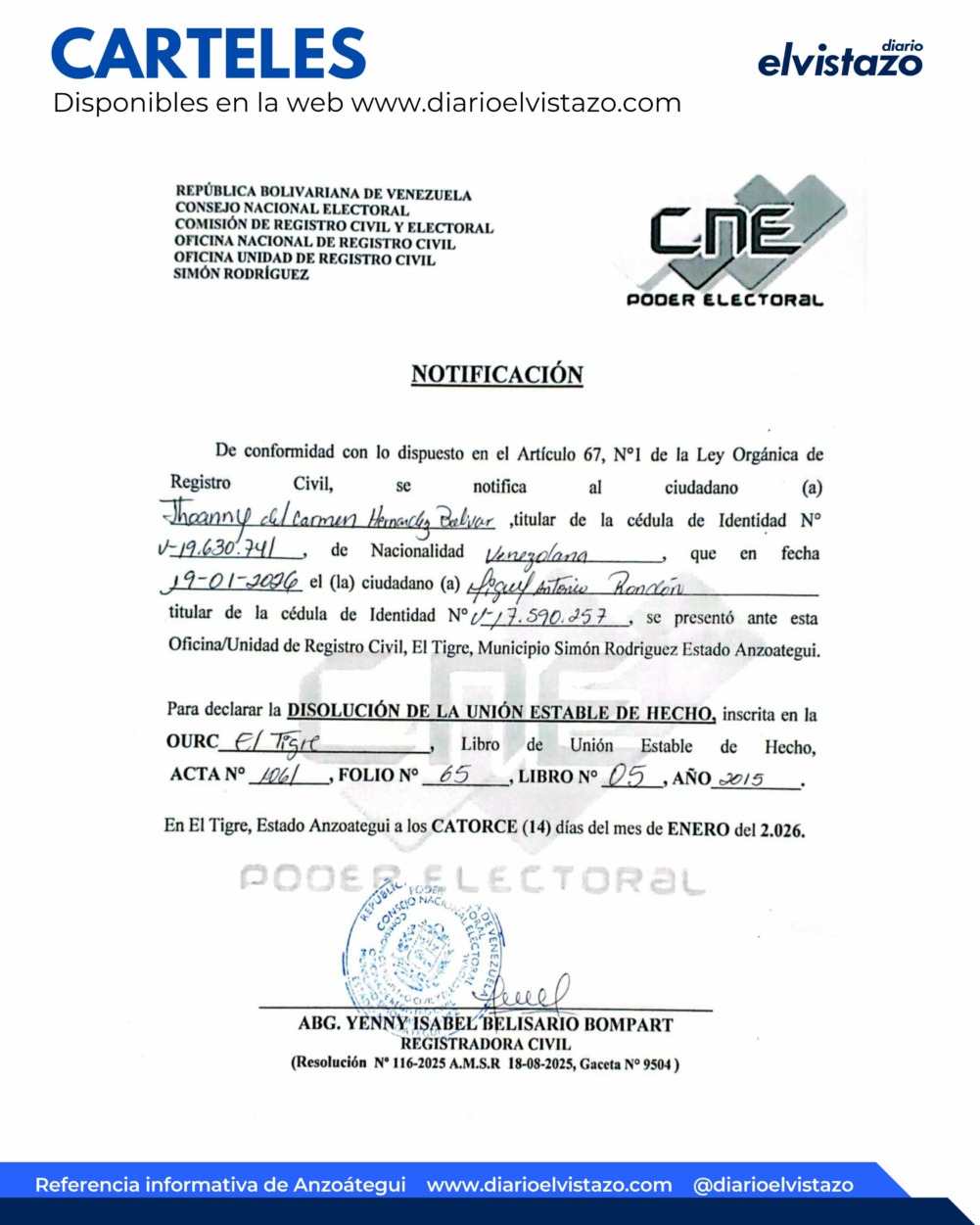 La Oficina Unidad de Registro Civil del municipio Simón Rodríguez dirigida por la Abg. Yenny Isabel Belisario Bompart, emitió una notificación de fecha 19 de Enero de 2026, en atención a los ciudadanos Jhoanny del Carmen Hernández Bolívar, titular de la cédula de identidad N° V- 19.630.741 y Miguel Antonio Rondón titular de la cédula de identidad N° V- 17.590.257. Asunto: Disolución de Unión Estable de Hecho.