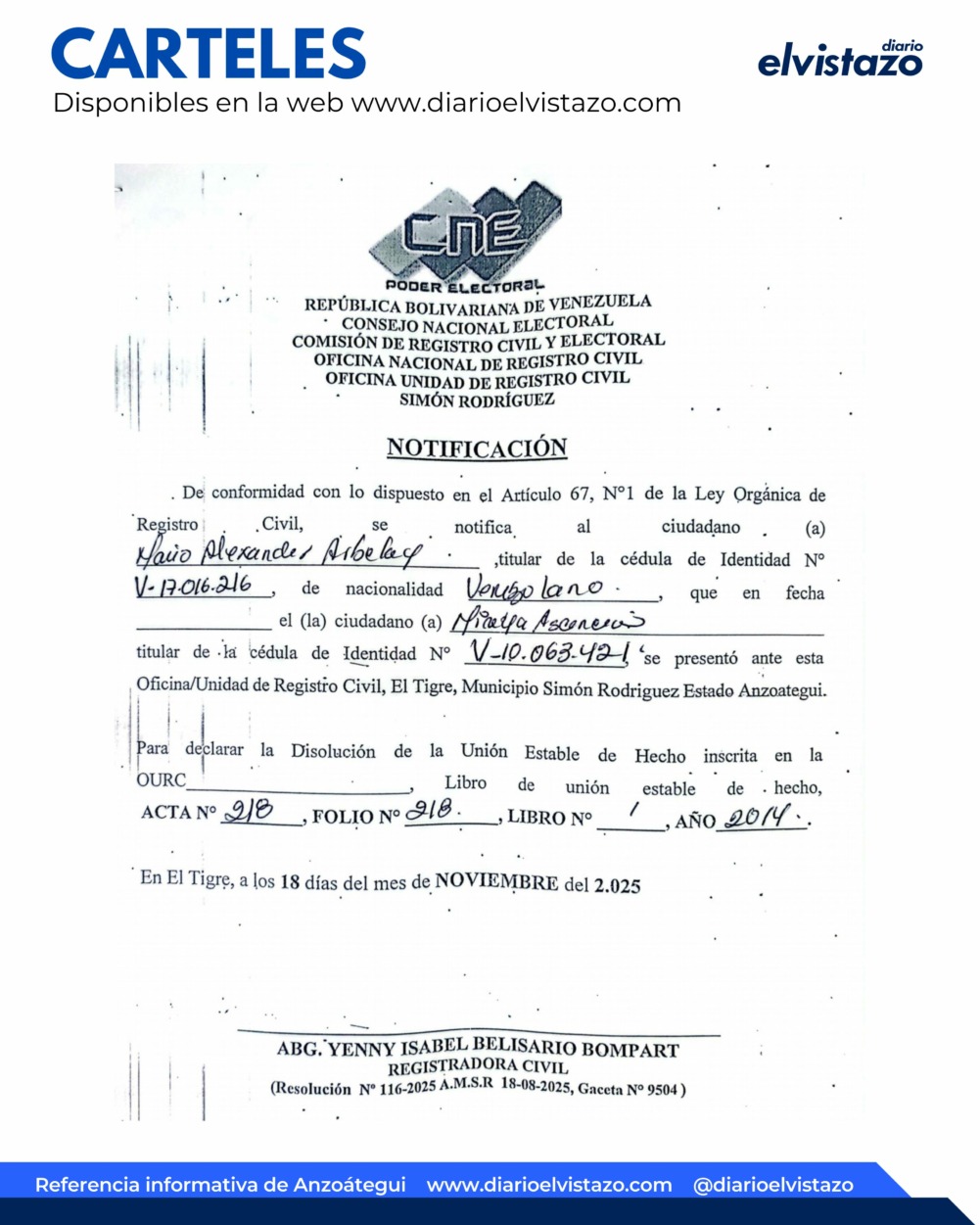 La Oficina Unidad de Registro Civil del municipio Simón Rodríguez dirigida por la Abg. Yenny Isabel Belisario Bompart, emitió una notificación de fecha 18 de Noviembre de 2025, en atención a los ciudadanos Mario Alexander Arbelay, titular de la cédula de identidad N° V- 17.016.216 y Mireya Ascencion titular de la cédula de identidad N° V- 10.063.421. Asunto: Disolución de Unión Estable de Hecho.