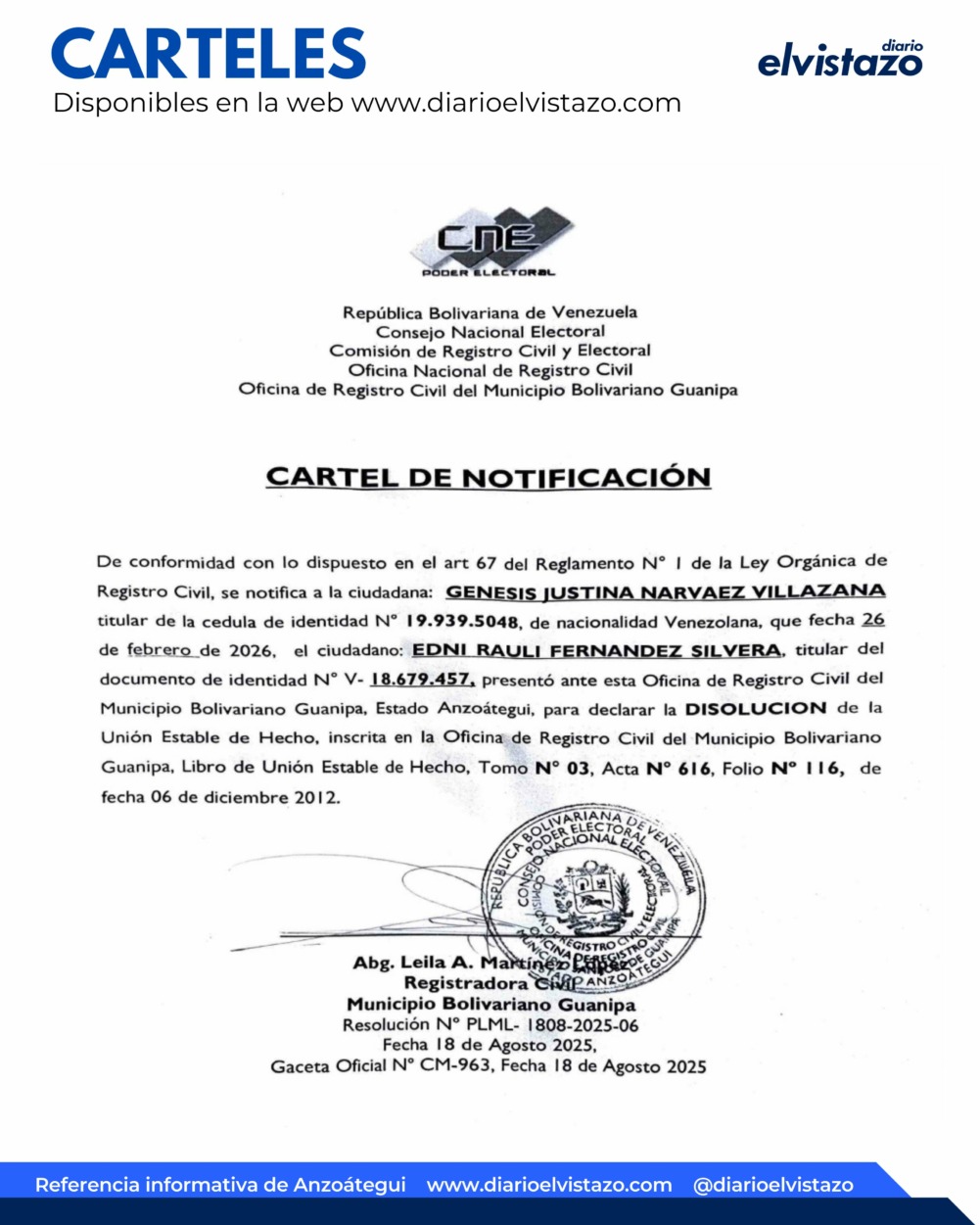El Registro Civil del municipio Bolivariano Guanipa dirigido por la Abg. Leila Martínez López, emitió un cartel de notificación de fecha 26 de Febrero 2026 para declarar la Disolución de la Unión Estable de Hecho en atención a los ciudadanos Edni Rauli Fernández Silvera, C.I. 18.679.457 y Génesis Justina Narváez Villazana, C.I. 19.939.5048.