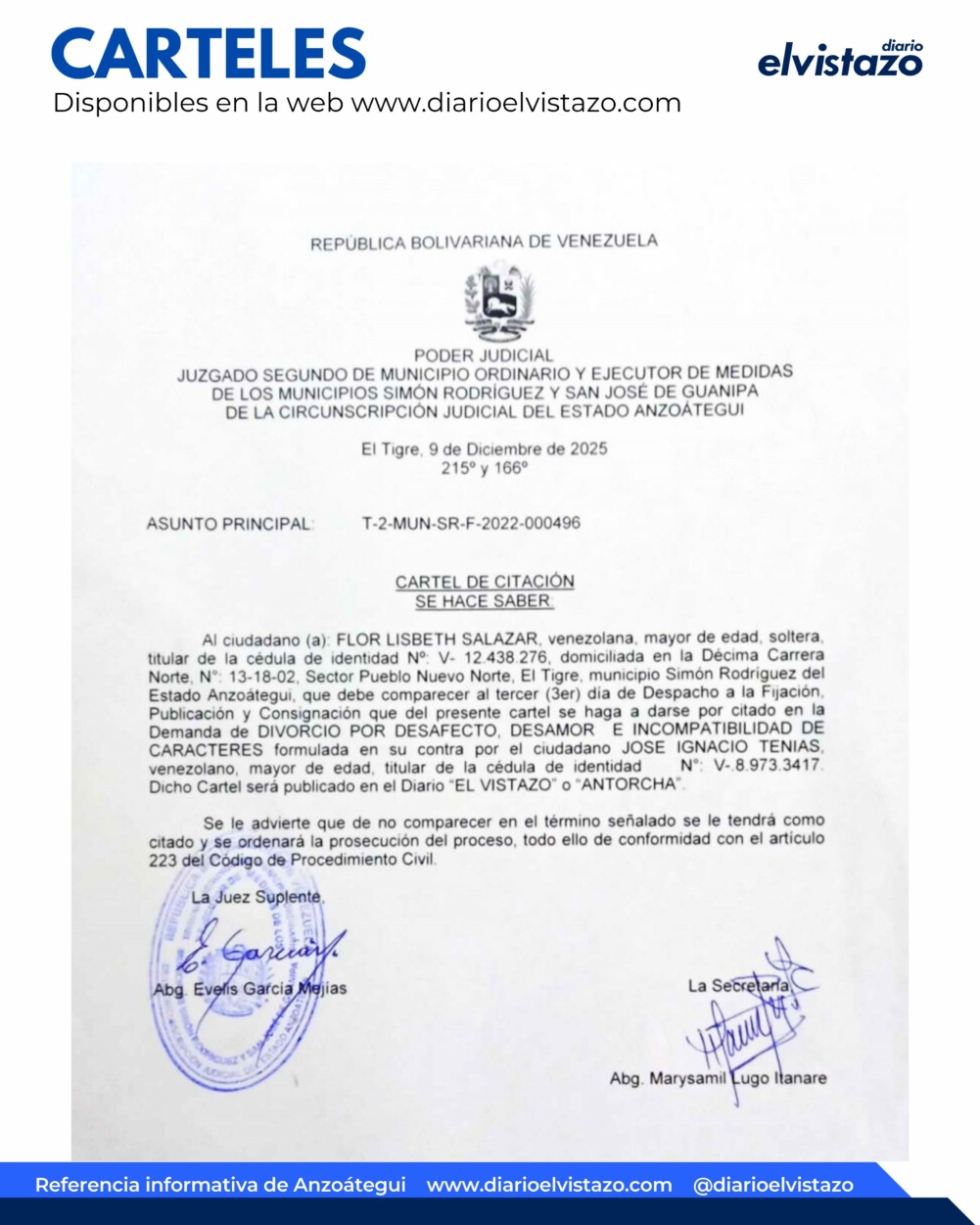 El Juzgado Segundo de municipio ordinario y ejecutor de medidas de los municipios Simón Rodríguez y San José de Guanipa, de la Circunscripción Judicial del Estado Anzoátegui, dirigido por la jueza Evelis García Mejías, emitió un Cartel de Citación de fecha 9 de diciembre de 2025, en atención a la solicitud de Divorcio dirigida a los ciudadanos Flor Lisbeth Salazar, venezolana, mayor de edad, titular de la cédula de identidad N° V- 12.438.276 y José Ignacio Tenías, venezolano, mayor de edad, titular de la cédula de identidad N° V- 89733417.