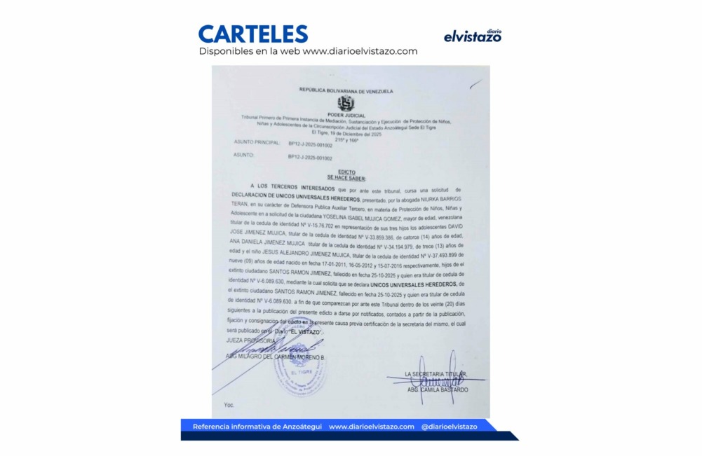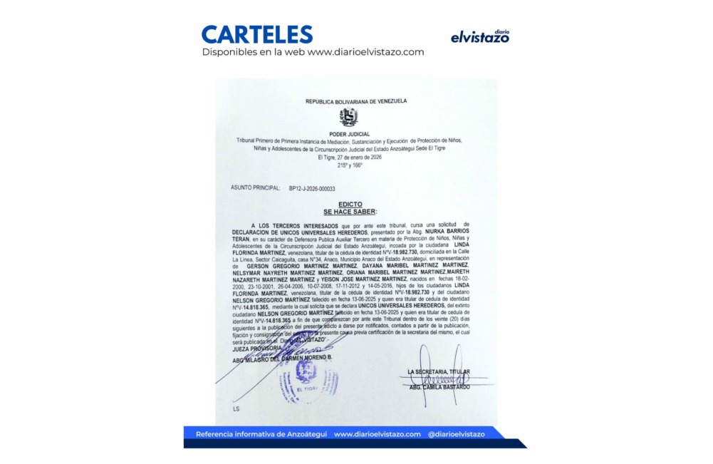 El Tribunal Tercero de Municipio Ordinario y Ejecutor de Medidas de los Municipios Simón Rodríguez y San José de Guanipa de la Circunscripción Judicial del estado Anzoátegui, dirigido por el juez Norman García Parra, emitió un cartel de citación de fecha 20 de febrero 2025, en atención a los ciudadanos Jackson José Noguera Carpio, C.I. V 18.981.177 y Lisbeth Yohanna Pinto Navas, C.I. V 16.077.551. Asunto: Divorcio por desafecto.