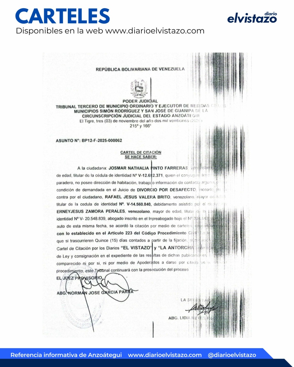 El Tribunal Tercero de Municipio Ordinario y Ejecutor de Medidas de los Municipios Simón Rodríguez y San José de Guanipa de la Circunscripción Judicial del estado Anzoátegui, dirigido por el juez Norman García Parra, emitió un Cartel de Citación de fecha 3 de noviembre de 2025, en atención a los ciudadanos Josmar Nathalia Pinto Farreras, venezolana, cédula de identidad N° V-12.682.371 y Rafael Jesús Valera Brito, venezolano, cédula de identidad N° V- 14.560.840. Asunto: Divorcio por desafecto.