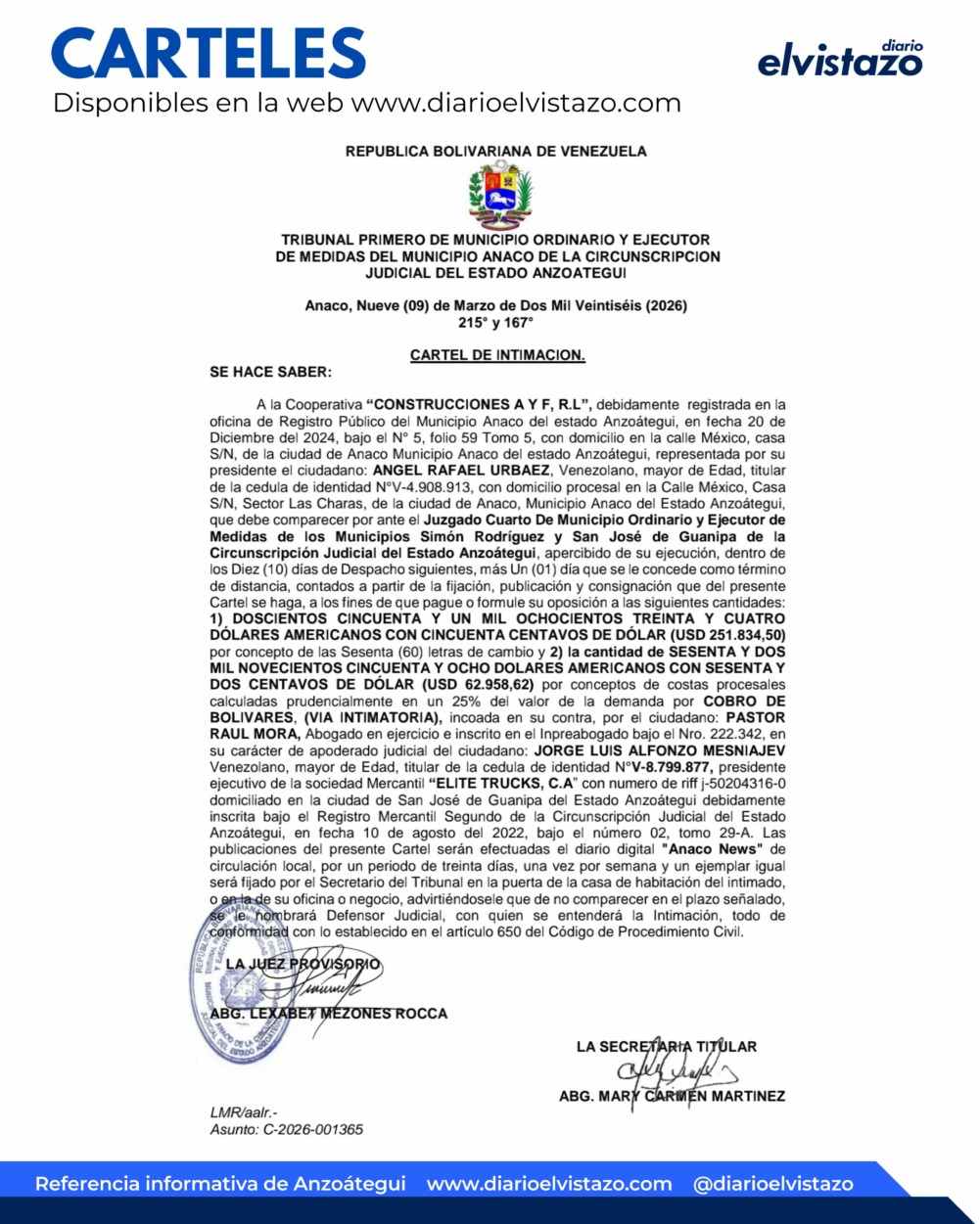 El Tribunal Primero de Municipio Ordinario y Ejecutor de Medidas del municipio Anaco, estado Anzoátegui, dirigido por la juez Lexabet Mezones Rocca, emitió un Cartel de Intimación de fecha 9 de marzo 2026 en atención a Construcciones A y F, R.L. representada por su presidente el ciudadano Ángel Rafael Urbáez, venezolano, mayor de edad, titular de la cédula de identidad N° V-4908913. Asunto: Demanda por Cobro de Bolívares incoada en su contra por el ciudadano Jore Luis Alfonzo Mesniajev, venezolano, mayor de edad, titular de la cédua de identidad N° 8.799.877 presidente ejecutivo de la Sociedad Mercantil Elite Trucks C.A.