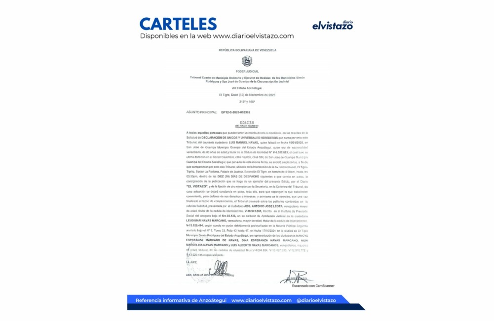 El Juzgado Segundo de Primera Instancia Agraria de la Circunscripción Judicial del Estado Anzoátegui, El Tigre, dirigido por el juez Jesús Leonardo Quintero, emitió un Cartel de Notificación de fecha 30 de enero de 2025, en atención a todas aquellas personas naturales o jurídicas de carácter público o privado, nacional o extranjero, que se crean con interés en la causa que es llevada por ante este tribunal contentiva del juicio por Medida Autónoma y Autosatisfactiva de Protección al Desarrollo y Continuidad de la Actividad Agroproductiva presentada por el ciudadano Edgar Rafael Lizardo Delgado, venezolano, mayor de edad, titular de la cédula de identidad N° V-7.831.043 sobre un lote de terreno denominado «El Socuy» ubicado en el sector Morichal Largo, asentamiento campesino Mesa del Merey Coloradito, parroquia Soledad, municipio Independencia del estado Anzoátegui.