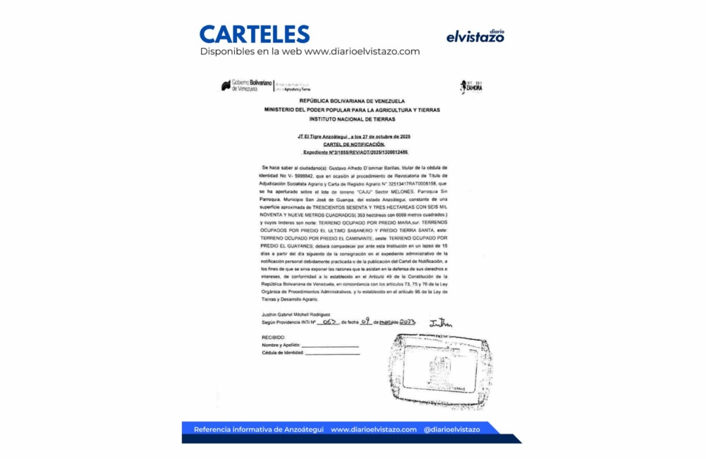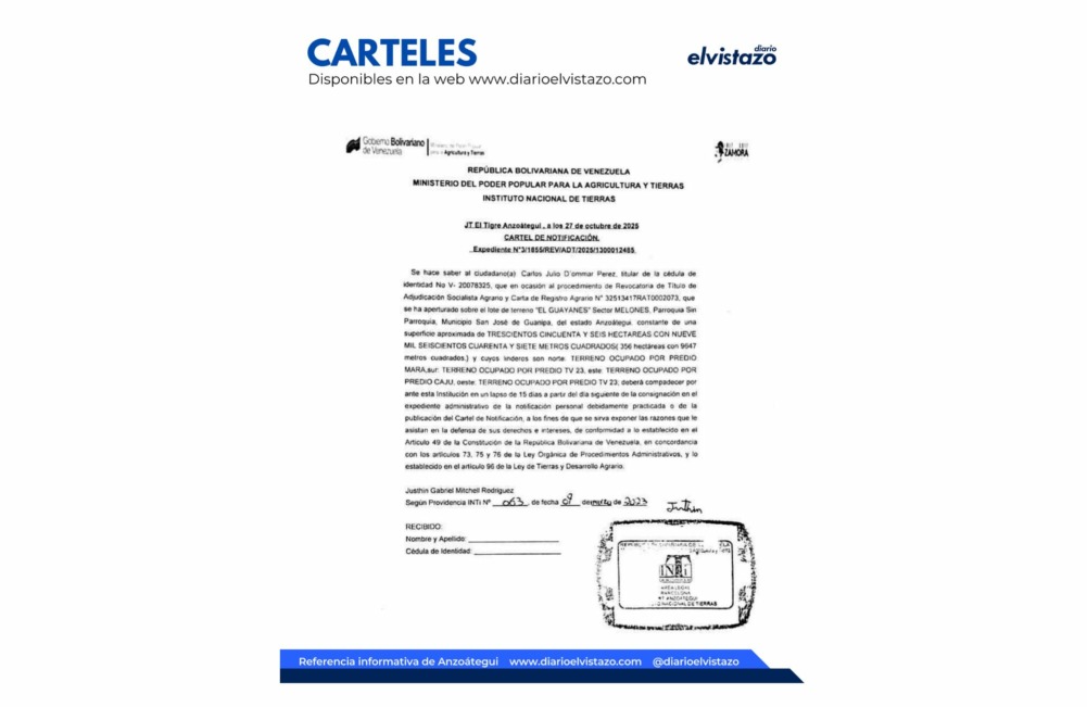 El Instituto Nacional de Tierras, JT El Tigre, estado Anzoátegui, emitió un cartel de notificación de fecha 18 de febrero de 2025, en atención a Jimmy Jesús Moreno Alvarado, titular de la cédula de identidad N° V – 12.014.816, y el lote de terreno «Francisca Duarte», sector Guara 13, parroquia Cantaura, municipio Pedro María Freites, estado Anzoátegui.