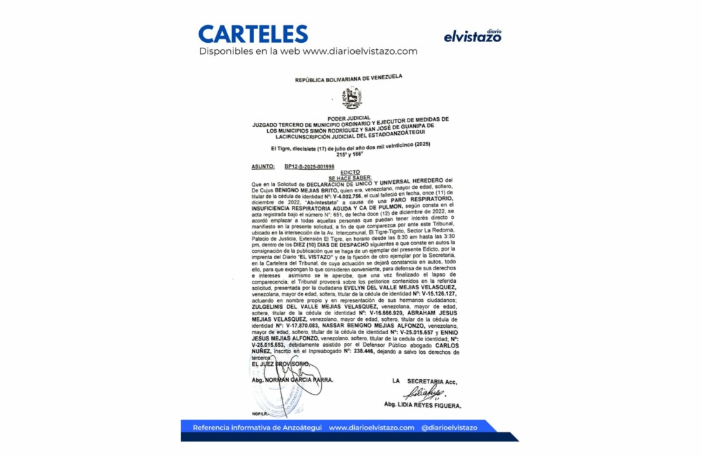 El Juzgado Tercero de Municipio Ordinario y Ejecutor de Medidas de los Municipios Simón Rodríguez y San José de Guanipa de la Circunscripción Judicial del estado Anzoátegui, a cargo de la jueza Dorilma Pinto Perales, emitió un cartel de citación de fecha 29 de junio de 2023, en atención a los ciudadanos William José Carrillo Camacho C.I.: V 17.161.949 y Melania Rosalía Cermeño C.I. V 14.653.347.