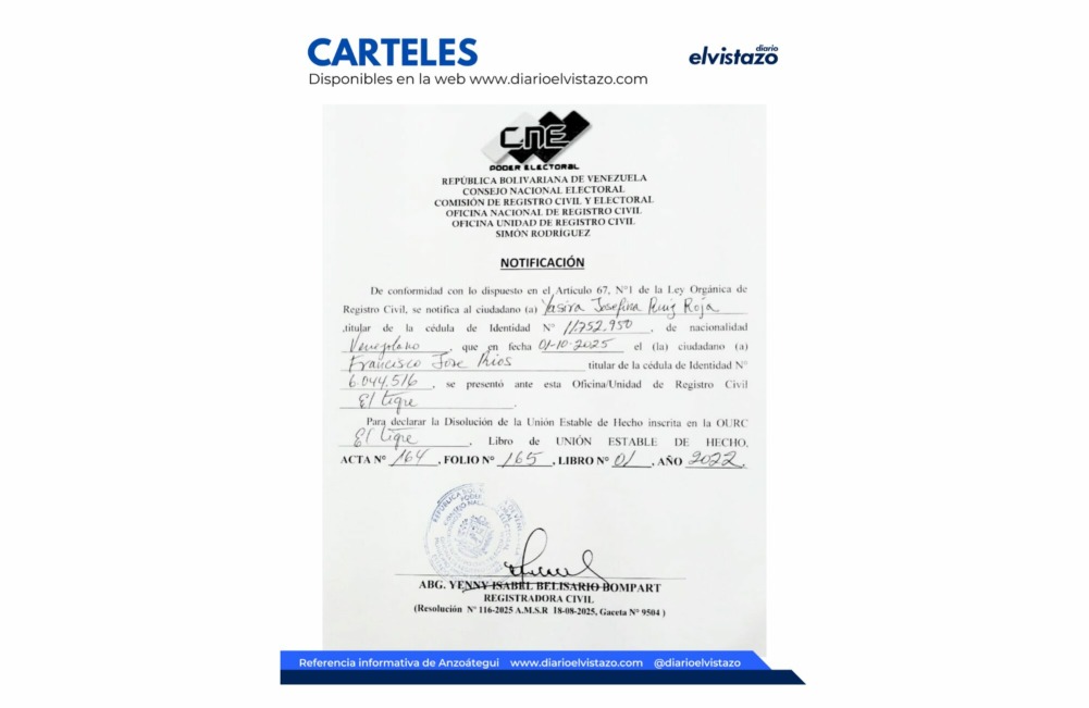 El Instituto Nacional de Tierras, JT El Tigre, estado Anzoátegui, emitió un cartel de notificación de fecha 22 de septiembre de 2023, en atención al ciudadano Rency José Hernández, C.I. V 16.573.902.