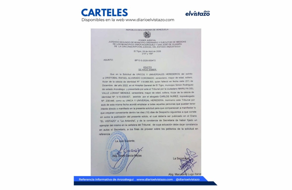 El Instituto Nacional de Tierras, JT El Tigre, estado Anzoátegui, emitió un cartel de notificación de fecha 08 de febrero 2024, en atención a Argenis Giovanny Goyo Uranga, titular de la cédula de identidad N° V-7.555.092 Asunto: Lote de terreno «Mi Ranchito», sector La Concordia, parroquia Cantaura, municipio Pedro María Freites, estado Anzoátegui.