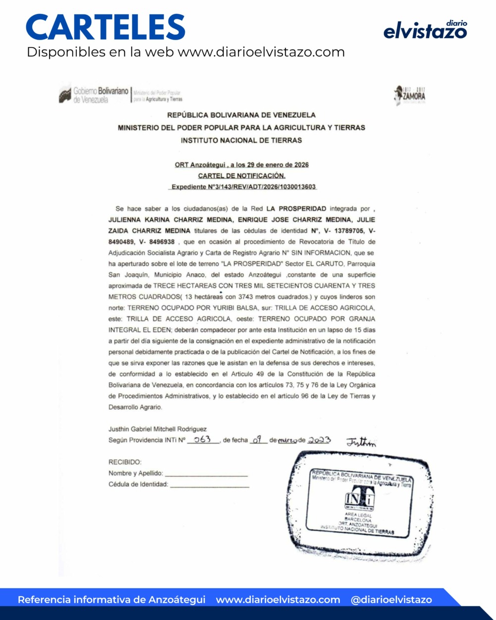 El INTI, Instituto Nacional de Tierras, ORT Anzoátegui, emitió un Cartel de Notificación de fecha 29 de enero de 2026, en atención a Red La Prosperidad integrada por Julienna Karina Charriz Medina, Enrique José Charriz Medina, Julie Zaida Charriz Medina, titulares de las cédulas de identidad N° V-13.789.705, V-8.490.489, V-8.496.938 y el lote de terreno «La Prosperidad» sector El Caruto, parroquia San Joaquín, municipio Anaco del estado Anzoátegui.