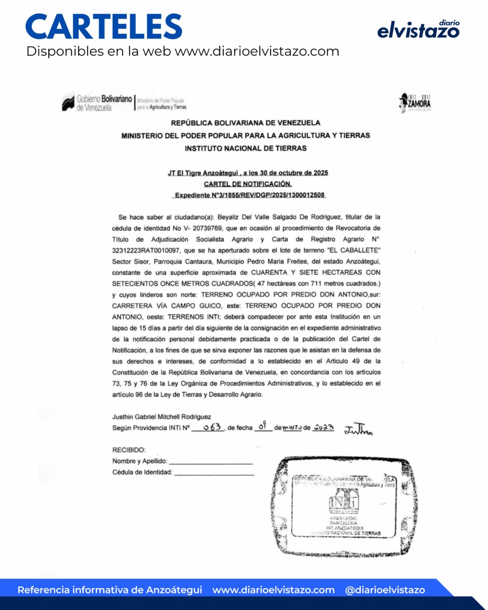 El Instituto Nacional de Tierras, JT El Tigre, Anzoátegui, emitió un cartel de notificación de fecha 30 de octubre de 2025, en atención a Beyaliz del Valle Salgado de Rodríguez, titular de la cédula de identidad N° V – 20739769 y el lote de terreno «El Caballete», sector Sisor, parroquia Cantaura, municipio Pedro María Freites, estado Anzoátegui.