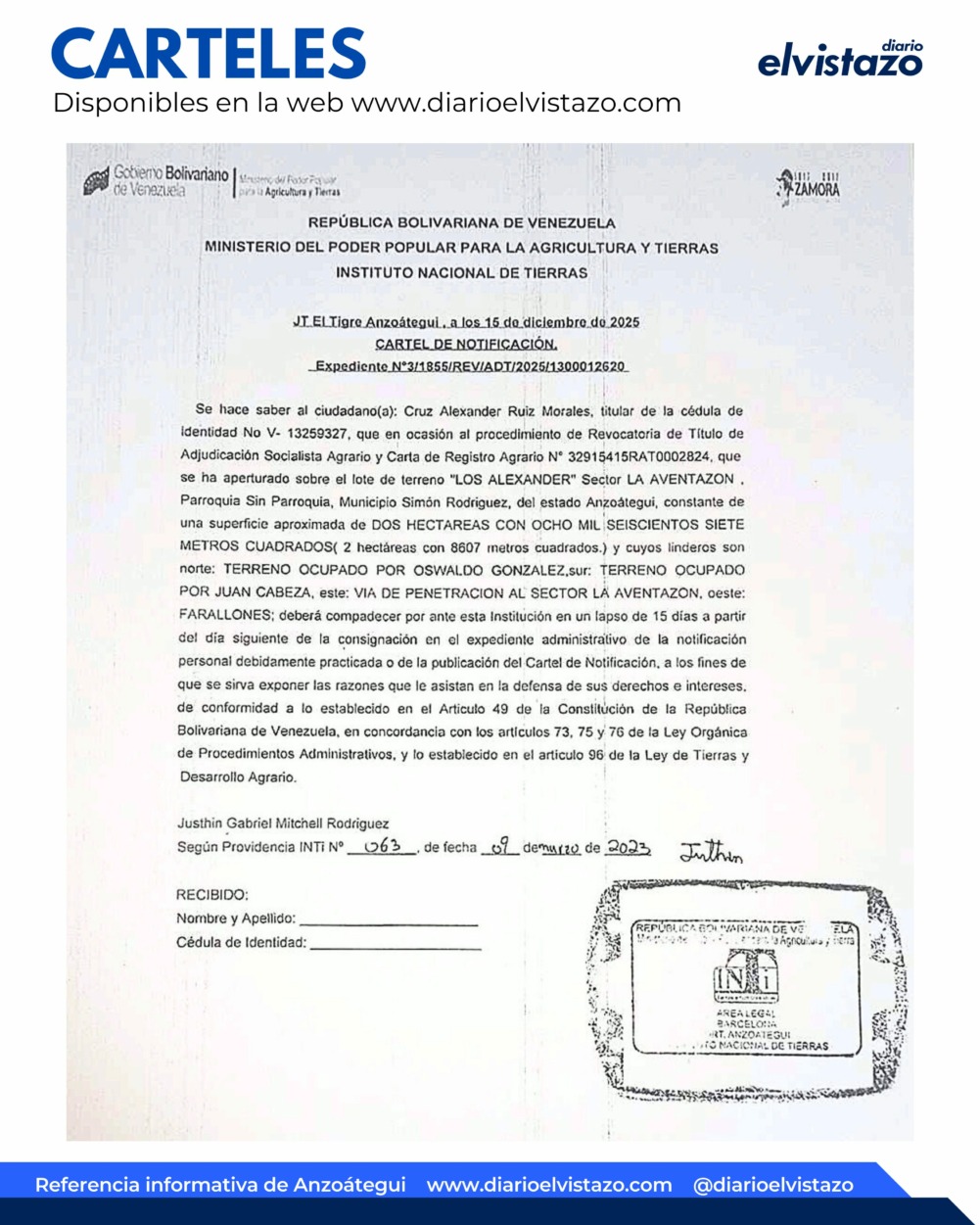El Instituto Nacional de Tierras, JT El Tigre, Anzoátegui, emitió un cartel de notificación de fecha 15 de diciembre de 2025, en atención a Cruz Alexander Ruiz Morales, titular de la cédula de identidad N° V – 13.259.327 y el lote de terreno «Los Alexander», sector La Aventazón, parroquia Sin Parroquia, municipio Simón Rodríguez, estado Anzoátegui.