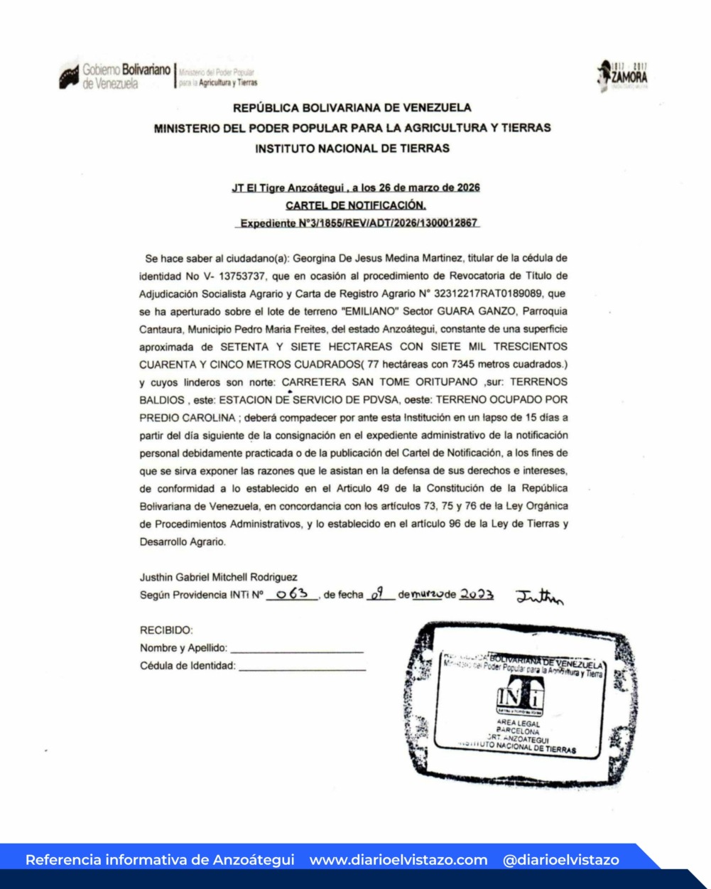 El Instituto Nacional de Tierras, JT El Tigre, Anzoátegui, emitió un cartel de notificación de fecha 26 de marzo de 2026, en atención a Georgina de Jesús Medina Martínez, titular de la cédula de identidad N° 13.753.737 y el lote de terreno «Emiliano», sector Guara Ganzo, parroquia Cantaura, municipio Pedro María Freites, estado Anzoátegui.