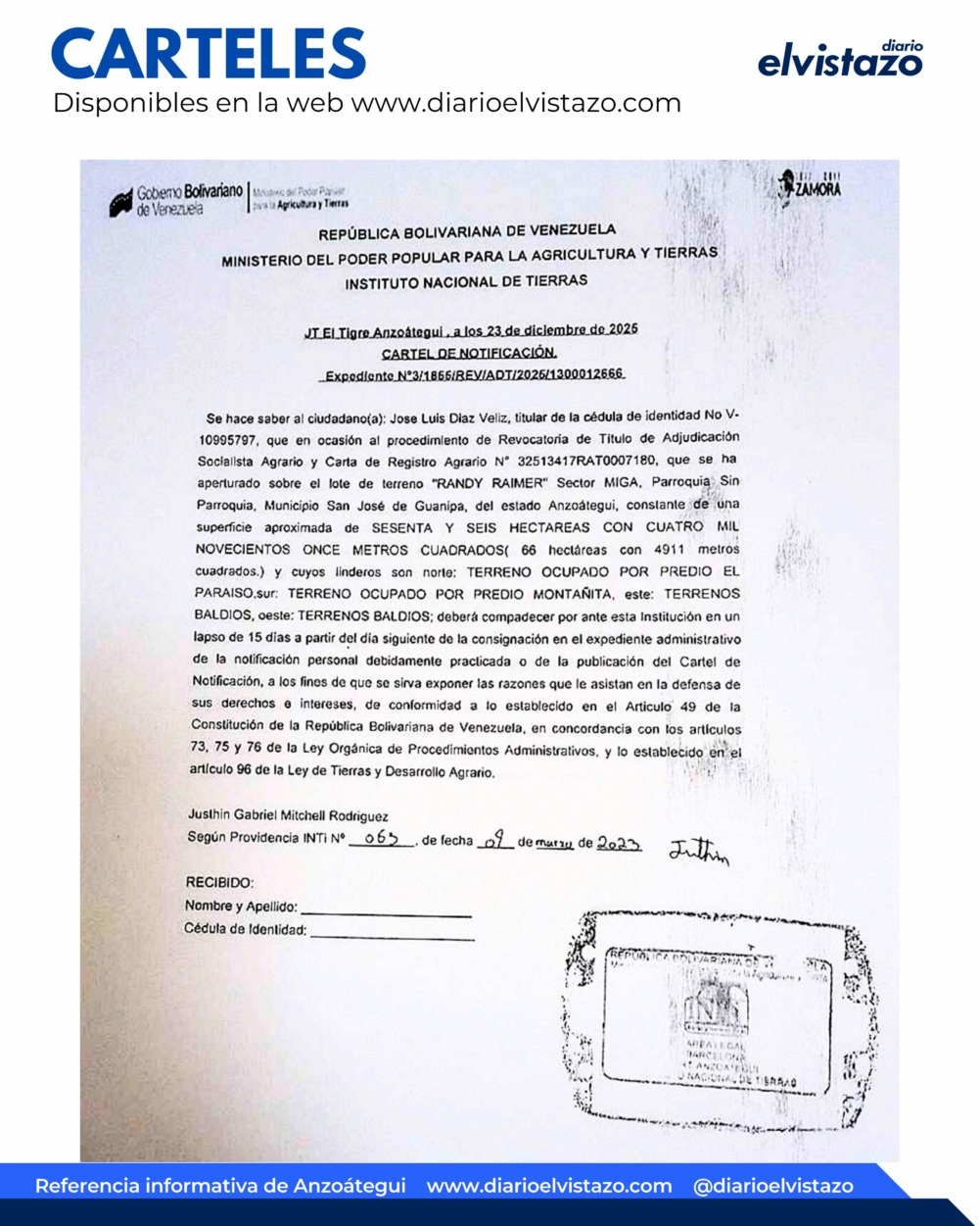 El Instituto Nacional de Tierras, JT El Tigre, Anzoátegui, emitió un cartel de notificación de fecha 23 de diciembre de 2025, en atención a José Luis Díaz Veliz, titular de la cédula de identidad N° 10.995.797 y el lote de terreno «Randy Raimer», sector Miga, parroquia sin parroquia, municipio San José de Guanipa, estado Anzoátegui.