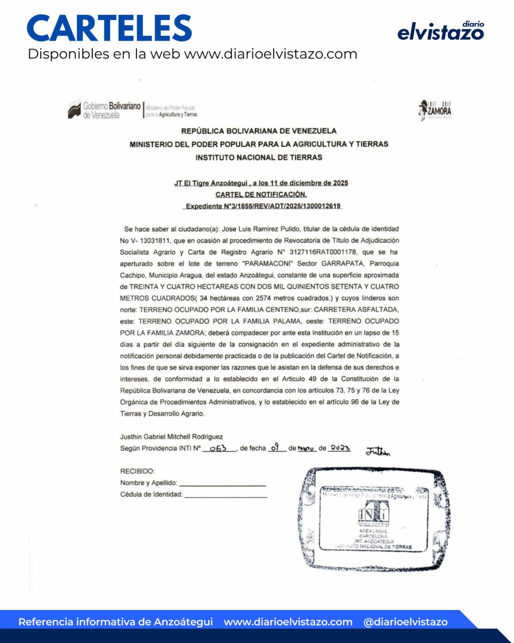 El Instituto Nacional de Tierras, JT El Tigre, Anzoátegui, emitió un cartel de notificación de fecha 11 de diciembre de 2025, en atención a José Luis Ramírez Pulido, titular de la cédula de identidad N° V – 13.031.811 y el lote de terreno «Paramaconi», sector Garrapata, parroquia Cachipo, municipio Aragua, estado Anzoátegui.