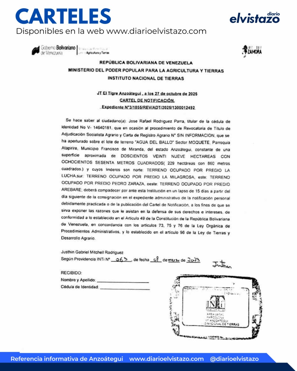El Instituto Nacional de Tierras, JT El Tigre, Anzoátegui, emitió un cartel de notificación de fecha 27 de octubre de 2025, en atención a José Rafael Rodríguez Parra, titular de la cédula de identidad N° V – 14.640.181 y el lote de terreno «Agua del Ballo», sector Moquete, parroquia Atapirire, municipio Francisco de Miranda, estado Anzoátegui.
