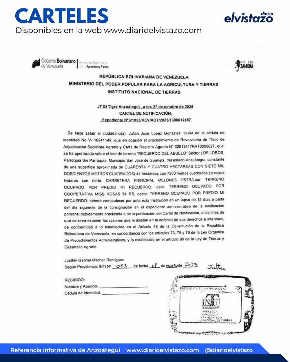 El Instituto Nacional de Tierras, JT El Tigre, Anzoátegui, emitió un cartel de notificación de fecha 27 de octubre de 2025, en atención a Julián José López González, titular de la cédula de identidad N° V – 10.941.149 y el lote de terreno «Recuerdo del Abuelo», sector Los Loros, parroquia sin parroquia, municipio San José de Guanipa, estado Anzoátegui.