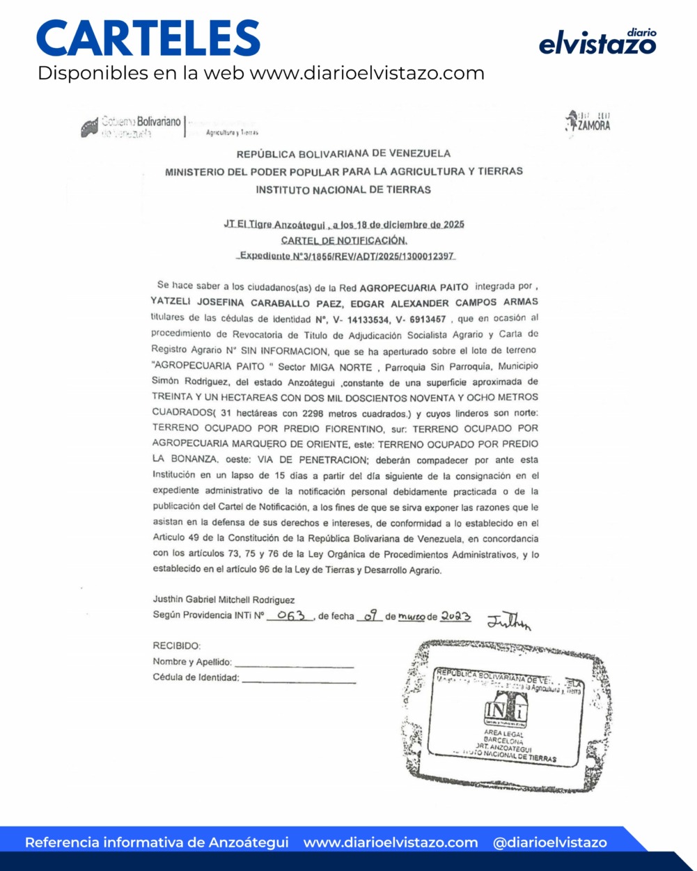 El Instituto Nacional de Tierras, JT El Tigre, Anzoátegui, emitió un cartel de notificación de fecha 18 de diciembre de 2025, en atención a la Red Agropecuaria Paito, integrada por Yatzeli Josefina Caraballo Páez, Edgar Alexander Campos Armas, titulares de las cédulas de identidad N° V – 14.133.534, y N° V – 6.913.457 y el lote de terreno «Agropecuaria Paito», sector Miga Norte, parroquia Sin Parroquia, municipio Simón Rodríguez, estado Anzoátegui.