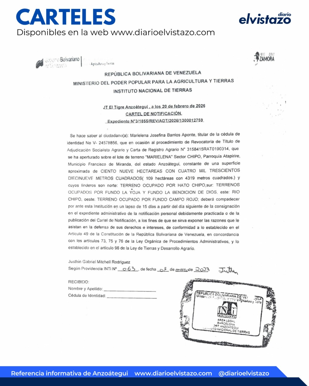 El Instituto Nacional de Tierras, JT El Tigre, Anzoátegui, emitió un cartel de notificación de fecha 20 de febrero de 2026, en atención a Marielena Josefina Barrios Aponte, titular de la cédula de identidad N° 24.578.856 y el lote de terreno «Marielena», sector Chipo, parroquia Atapirire, municipio Francisco de Miranda, estado Anzoátegui.