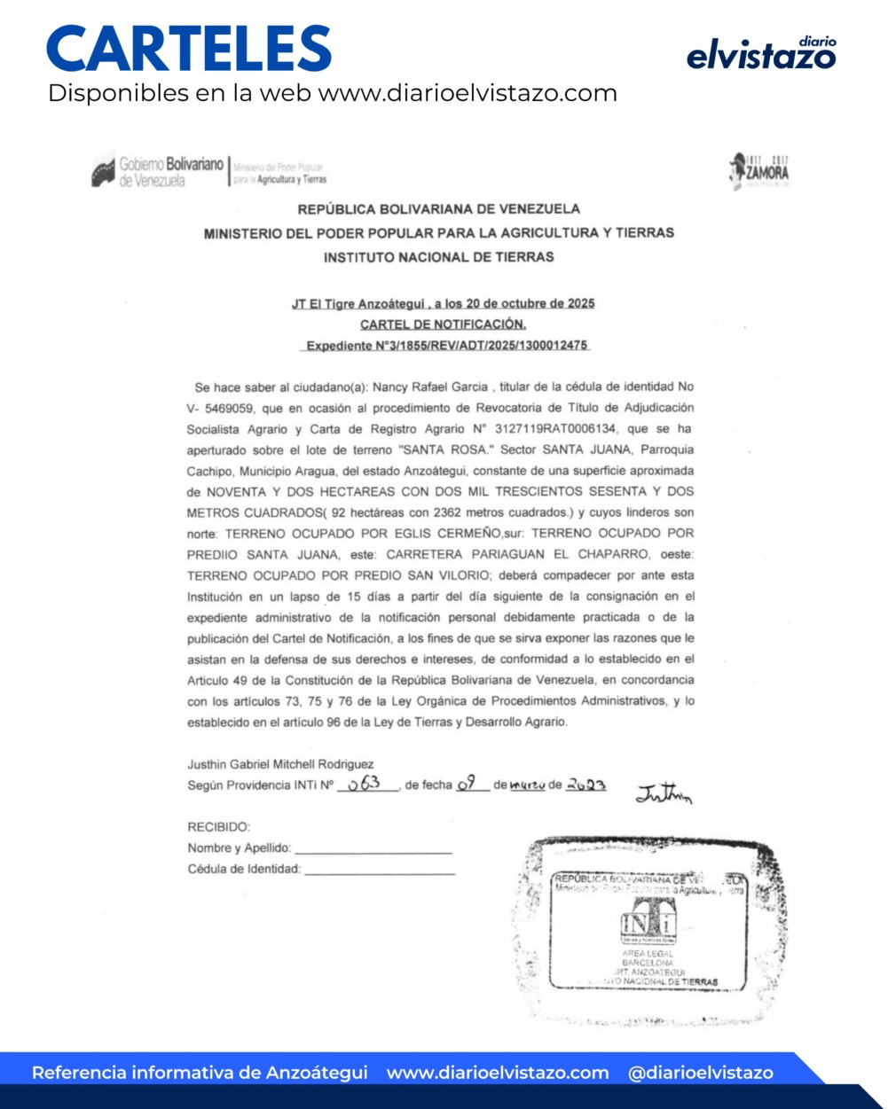 El Instituto Nacional de Tierras, JT El Tigre, Anzoátegui, emitió un cartel de notificación de fecha 20 de octubre de 2025, en atención a Nancy Rafael García, titular de la cédula de identidad N° V – 5.469.059 y el lote de terreno «Santa Rosa», sector Santa Juana, parroquia Cachipo, municipio Aragua, estado Anzoátegui.