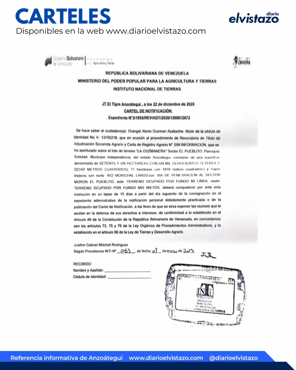 El Instituto Nacional de Tierras, JT El Tigre, Anzoátegui, emitió un cartel de notificación de fecha 22 de diciembre de 2025, en atención a Orangel Alexis Guzmán Azabache, titular de la cédula de identidad N° 13.156.219 y el lote de terreno «La Guzmanera», sector El Pueblito, parroquia Soledad, municipio Independencia, estado Anzoátegui.