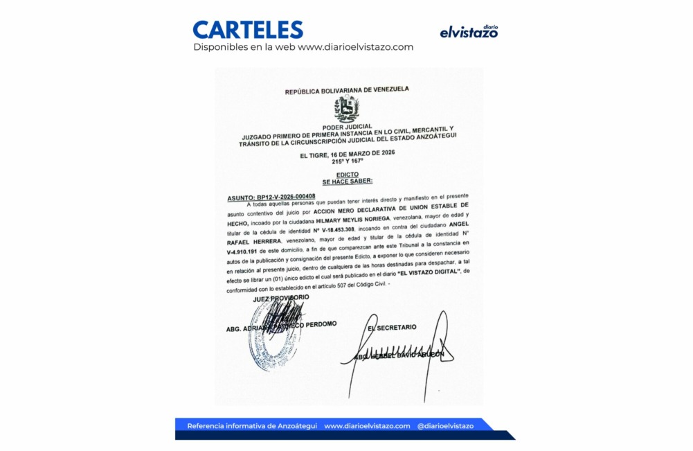 El Instituto Nacional de Tierras, JT El Tigre, Anzoátegui, emitió un cartel de notificación de fecha 4 de julio de 2025, en atención a Raquel Jesús Rosas Mora, titular de la cédula de identidad N° V – 15.376.243 y el lote de terreno «Las 4 Rosas», sector Miga Sur, parroquia sin parroquia, municipio Simón Rodríguez, estado Anzoátegui.