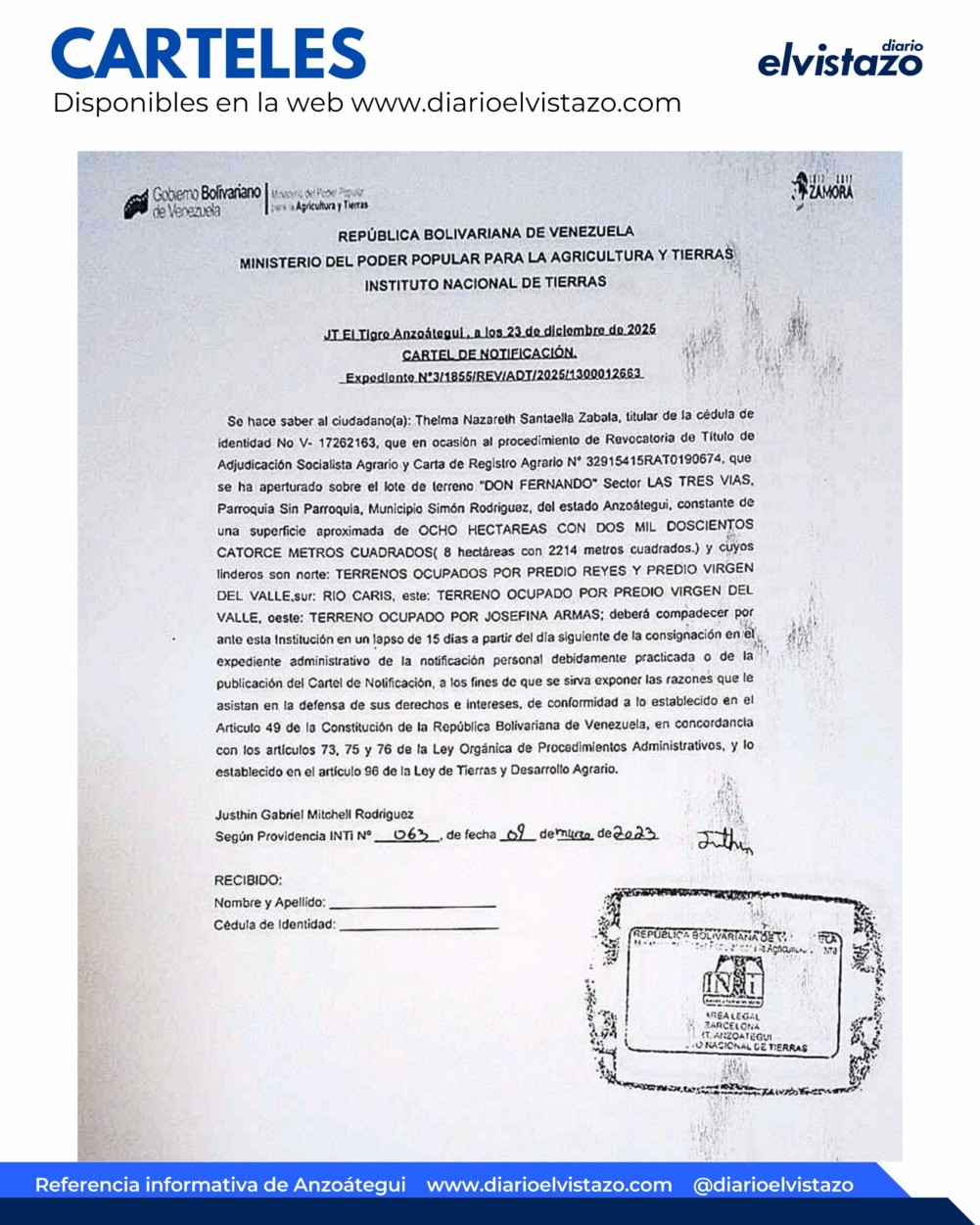 El Instituto Nacional de Tierras, JT El Tigre, Anzoátegui, emitió un cartel de notificación de fecha 23 de diciembre de 2025, en atención a Thelma Nazareth Santaella Zabala, titular de la cédula de identidad N° 17.262.163 y el lote de terreno «Don Fernando», sector Las Tres Vías, parroquia sin parroquia, municipio Simón Rodríguez, estado Anzoátegui.