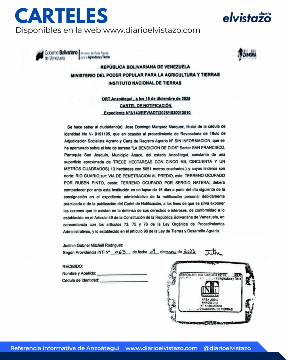 El INTI, Instituto Nacional de Tierras, ORT Anzoátegui, emitió un Cartel de Notificación de fecha 15 de diciembre de 2025, en atención a José Domingo Márquez Márquez, titular de la cédula de identidad N° V – 9.191.195 y el lote de terreno «La Bendición de Dios», sector San Francisco, parroquia San Joaquín, municipio Anaco, estado Anzoátegui.