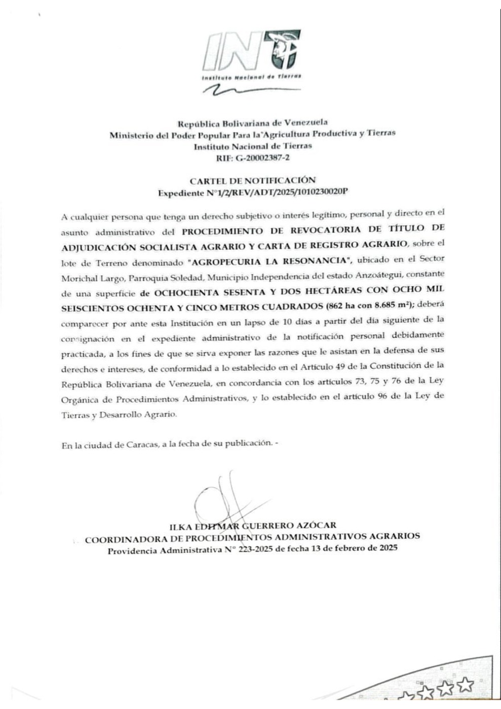 El INTI, Instituto Nacional de Tierras, emitió un Cartel de Notificación en relación al Procedimiento de Revocatoria de Título de Adjudicación Socialista Agrario y Carta de Registro Agrario, sobre el lote de terreno denominado «Agropecuaria La Resonancia», ubicado en el sector Morichal Largo, parroquia Soledad, municipio Independencia del estado Anzoátegui. El documento está suscrito por Ilka Guerrero Azócar, coordinadora de procedimientos administrativos agrarios.