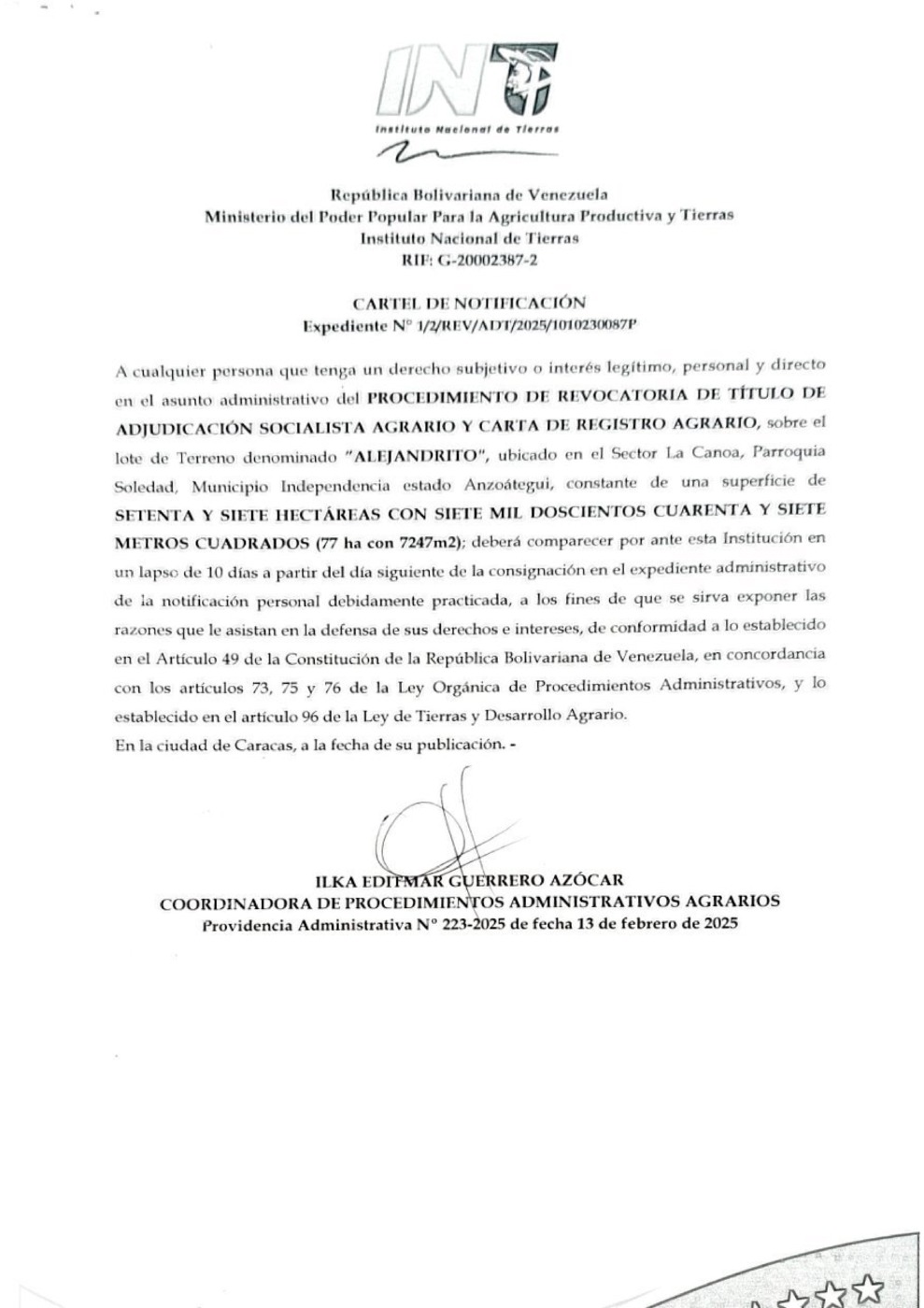El INTI, Instituto Nacional de Tierras, emitió un Cartel de Notificación en relación al Procedimiento de Revocatoria de Título de Adjudicación Socialista Agrario y Carta de Registro Agrario, sobre el lote de terreno denominado «Alejandrito», ubicado en el sector La Canoa, parroquia Soledad, municipio Independencia del estado Anzoátegui. El documento está suscrito por Ilka Guerrero Azócar, coordinadora de procedimientos administrativos agrarios.