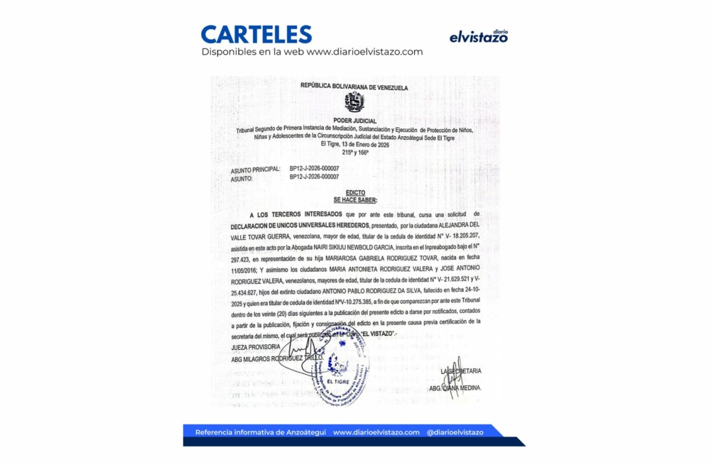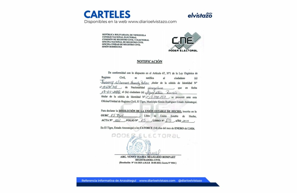 El INTI, Instituto Nacional de Tierras, emitió un Cartel de Notificación en relación al Procedimiento de Revocatoria de Título de Adjudicación Socialista Agrario y Carta de Registro Agrario, sobre el lote de terreno denominado «Barrancas de Chuapire», ubicado en el sector La Canoa, parroquia Soledad, municipio Independencia del estado Anzoátegui. El documento está suscrito por Ilka Guerrero Azócar, coordinadora de procedimientos administrativos agrarios.