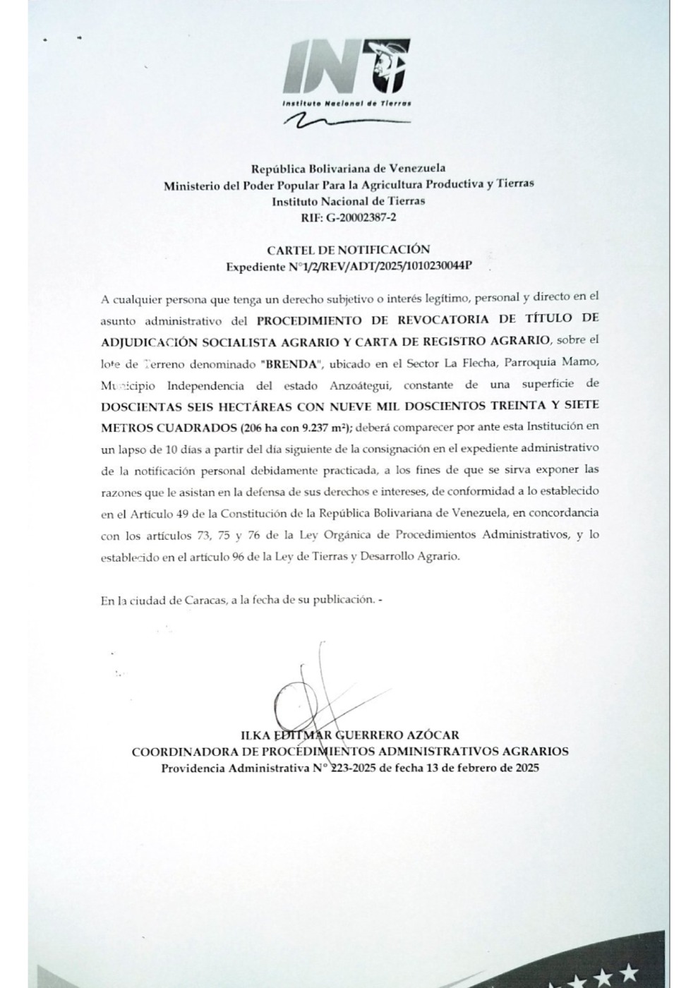 El INTI, Instituto Nacional de Tierras, emitió un Cartel de Notificación en relación al Procedimiento de Revocatoria de Título de Adjudicación Socialista Agrario y Carta de Registro Agrario, sobre el lote de terreno denominado «Brenda», ubicado en el sector La Flecha, parroquia Mamo, municipio Independencia del estado Anzoátegui. El documento está suscrito por Ilka Guerrero Azócar, coordinadora de procedimientos administrativos agrarios.