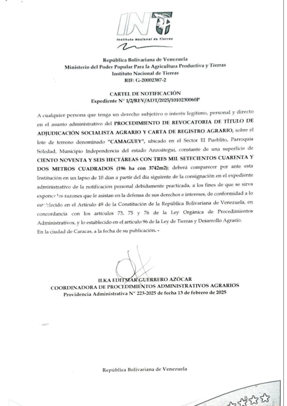 El INTI, Instituto Nacional de Tierras, emitió un Cartel de Notificación en relación al Procedimiento de Revocatoria de Título de Adjudicación Socialista Agrario y Carta de Registro Agrario, sobre el lote de terreno denominado «Camaguey», ubicado en el sector El Pueblito, parroquia Soledad, municipio Independencia del estado Anzoátegui. El documento está suscrito por Ilka Guerrero Azócar, coordinadora de procedimientos administrativos agrarios.