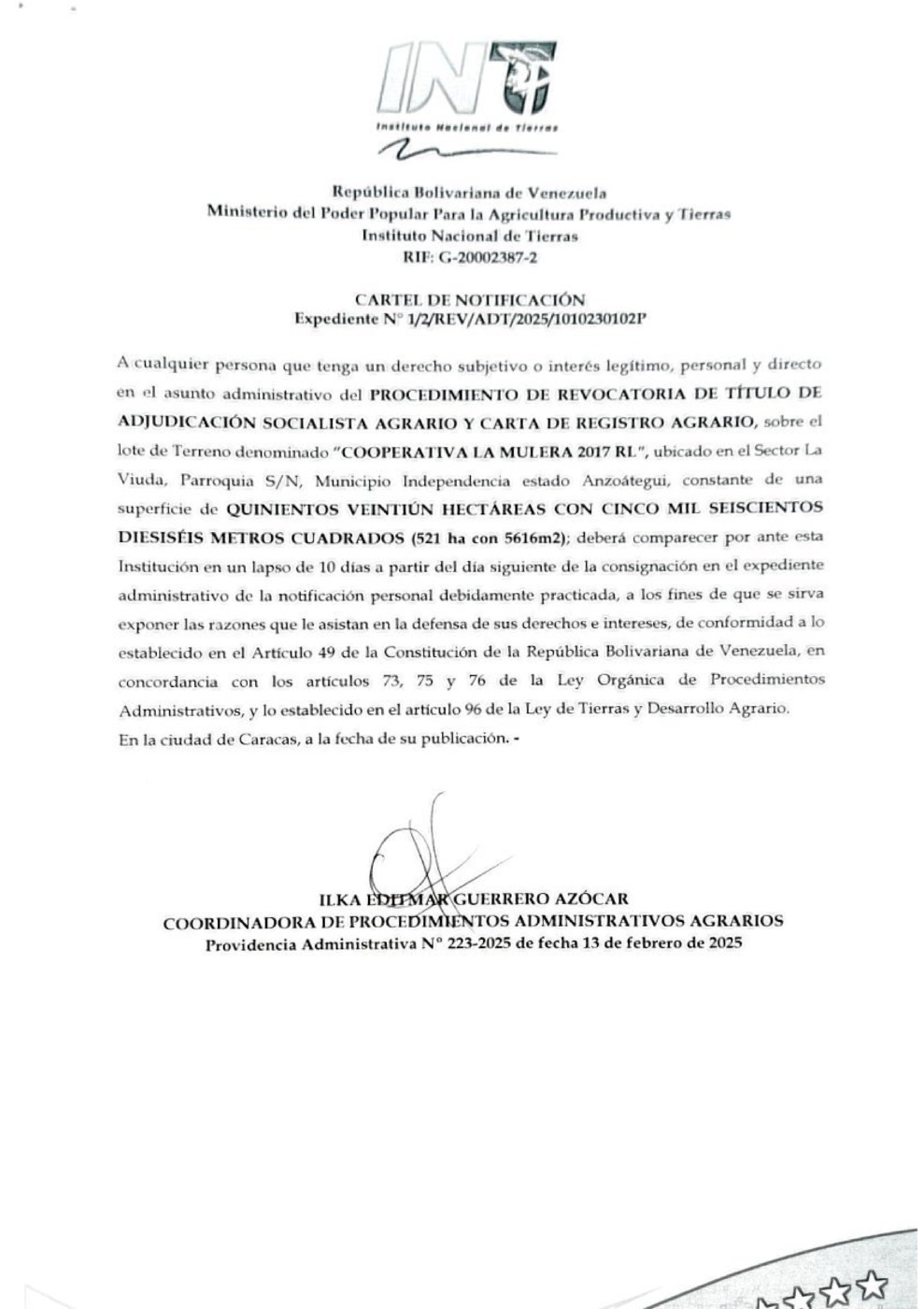 El INTI, Instituto Nacional de Tierras, emitió un Cartel de Notificación en relación al Procedimiento de Revocatoria de Título de Adjudicación Socialista Agrario y Carta de Registro Agrario, sobre el lote de terreno denominado «Cooperativa La Mulera 2017 RL», ubicado en el sector La Viuda, parroquia s/n, municipio Independencia del estado Anzoátegui. El documento está suscrito por Ilka Guerrero Azócar, coordinadora de procedimientos administrativos agrarios.