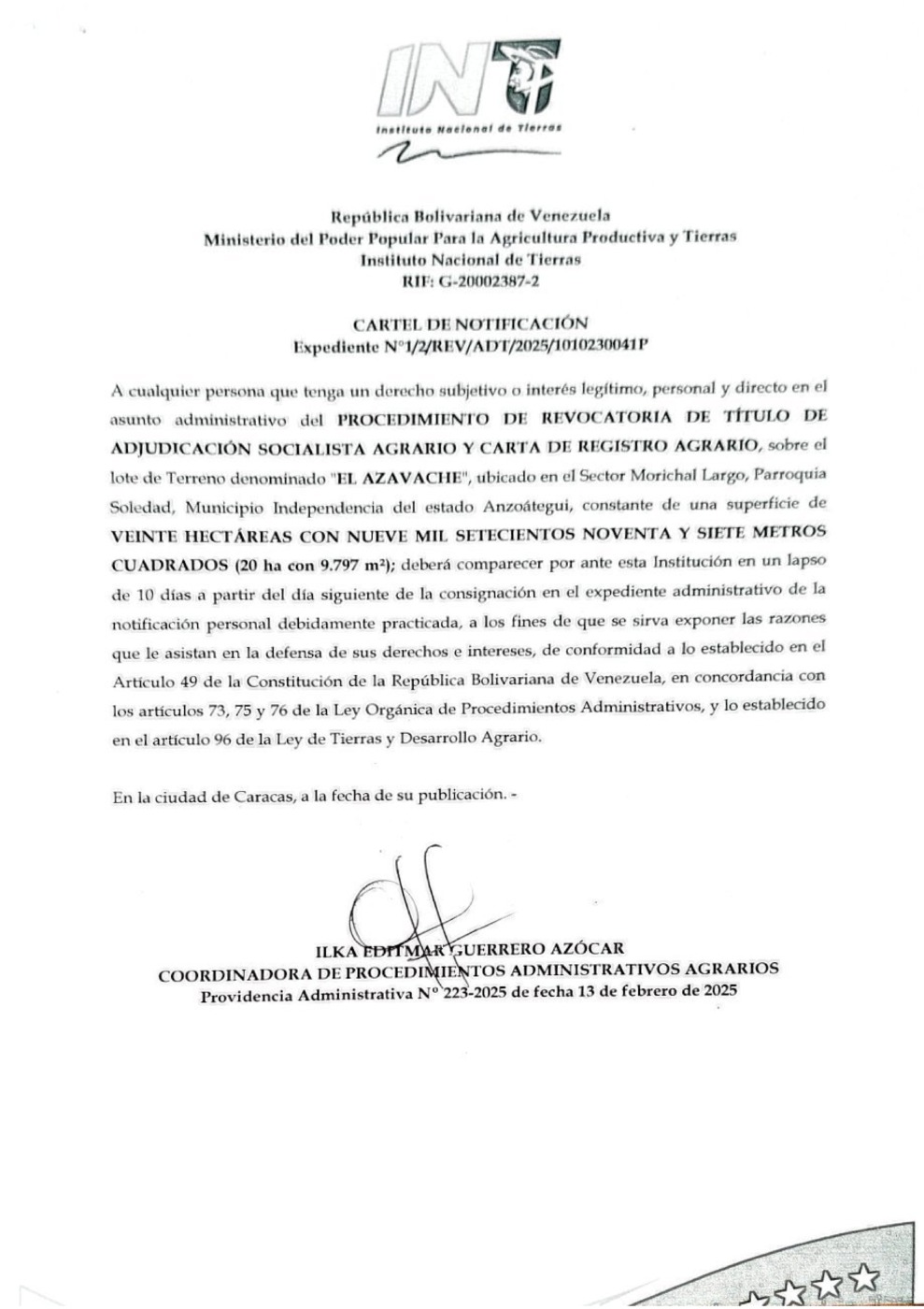 El INTI, Instituto Nacional de Tierras, emitió un Cartel de Notificación en relación al Procedimiento de Revocatoria de Título de Adjudicación Socialista Agrario y Carta de Registro Agrario, sobre el lote de terreno denominado «El Azabache», ubicado en el sector Morichal Largo, parroquia Soledad, municipio Independencia del estado Anzoátegui. El documento está suscrito por Ilka Guerrero Azócar, coordinadora de procedimientos administrativos agrarios.