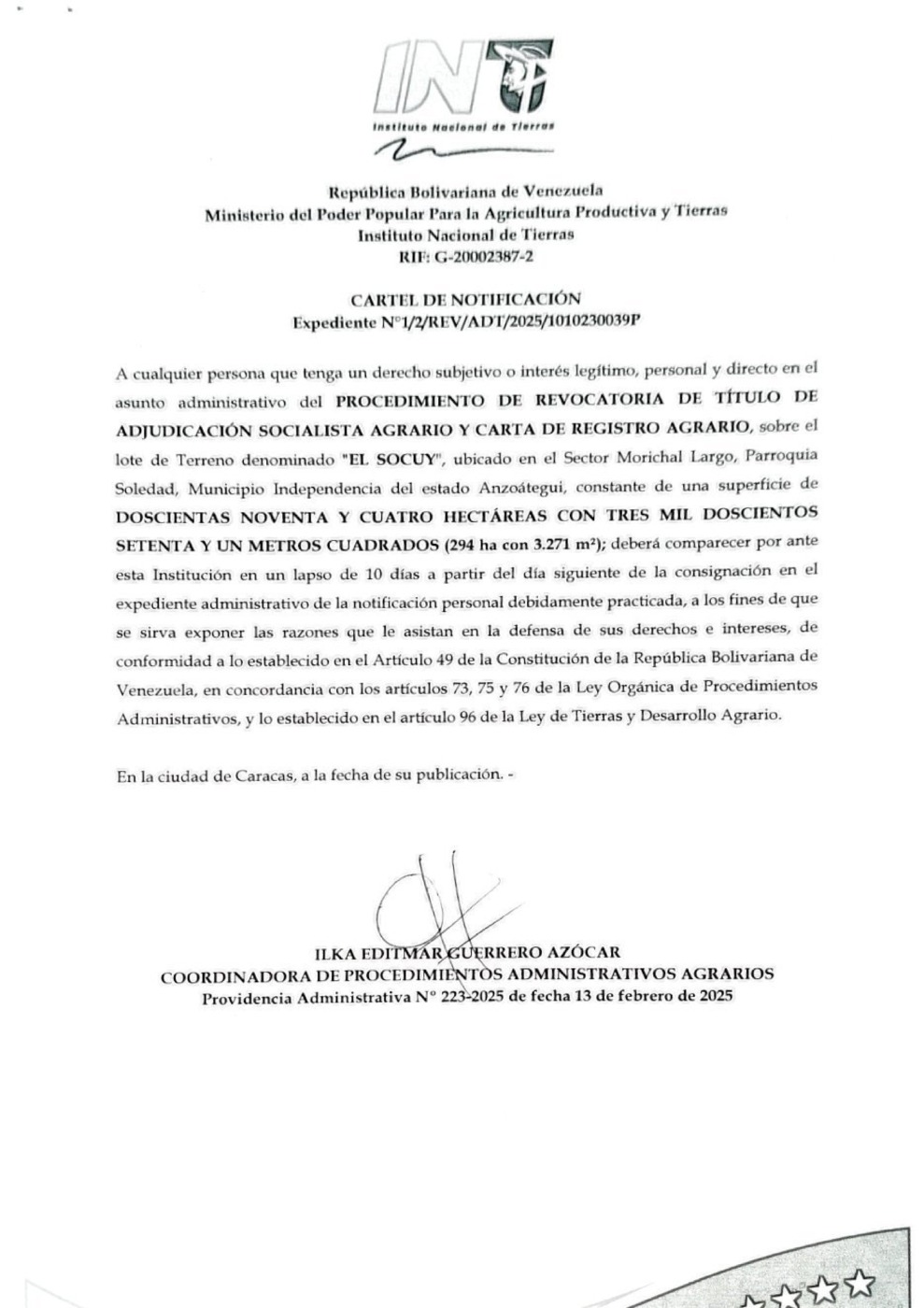 El INTI, Instituto Nacional de Tierras, emitió un Cartel de Notificación en relación al Procedimiento de Revocatoria de Título de Adjudicación Socialista Agrario y Carta de Registro Agrario, sobre el lote de terreno denominado «El Socuy», ubicado en el sector Morichal Largo, parroquia Soledad, municipio Independencia del estado Anzoátegui. El documento está suscrito por Ilka Guerrero Azócar, coordinadora de procedimientos administrativos agrarios.
