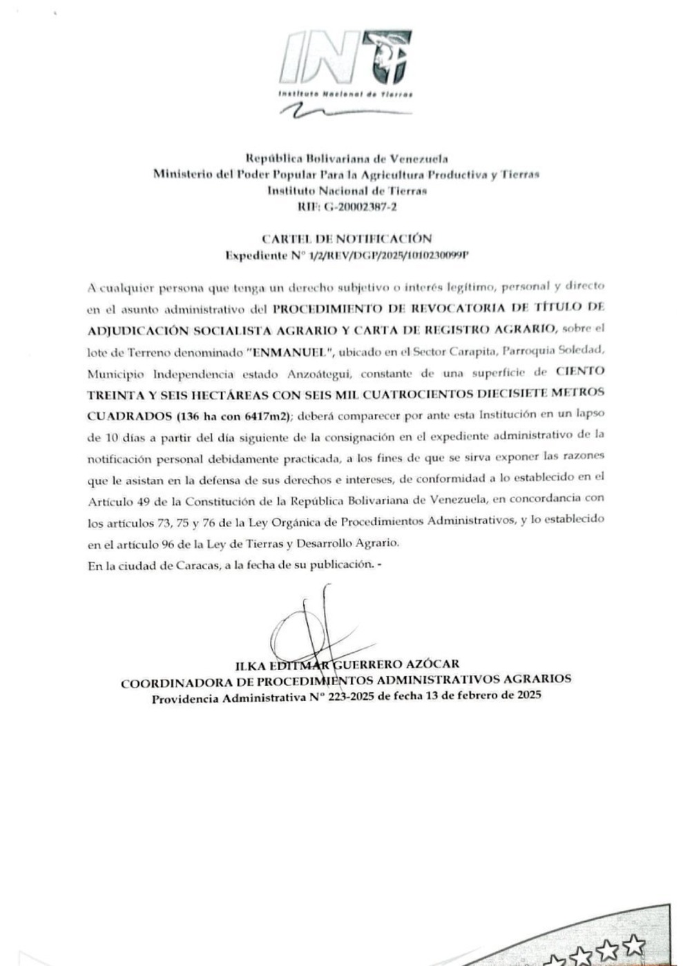 El INTI, Instituto Nacional de Tierras, emitió un Cartel de Notificación en relación al Procedimiento de Revocatoria de Título de Adjudicación Socialista Agrario y Carta de Registro Agrario, sobre el lote de terreno denominado «Enmanuel», ubicado en el sector Carapita, parroquia Soledad, municipio Independencia del estado Anzoátegui. El documento está suscrito por Ilka Guerrero Azócar, coordinadora de procedimientos administrativos agrarios.