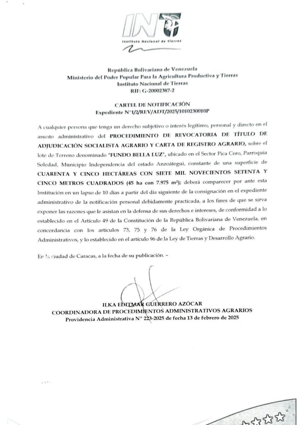 El INTI, Instituto Nacional de Tierras, emitió un Cartel de Notificación en relación al Procedimiento de Revocatoria de Título de Adjudicación Socialista Agrario y Carta de Registro Agrario, sobre el lote de terreno denominado «Fundo Bella Luz», ubicado en el sector Pica Cero, parroquia Soledad, municipio Independencia del estado Anzoátegui. El documento está suscrito por Ilka Guerrero Azócar, coordinadora de procedimientos administrativos agrarios.