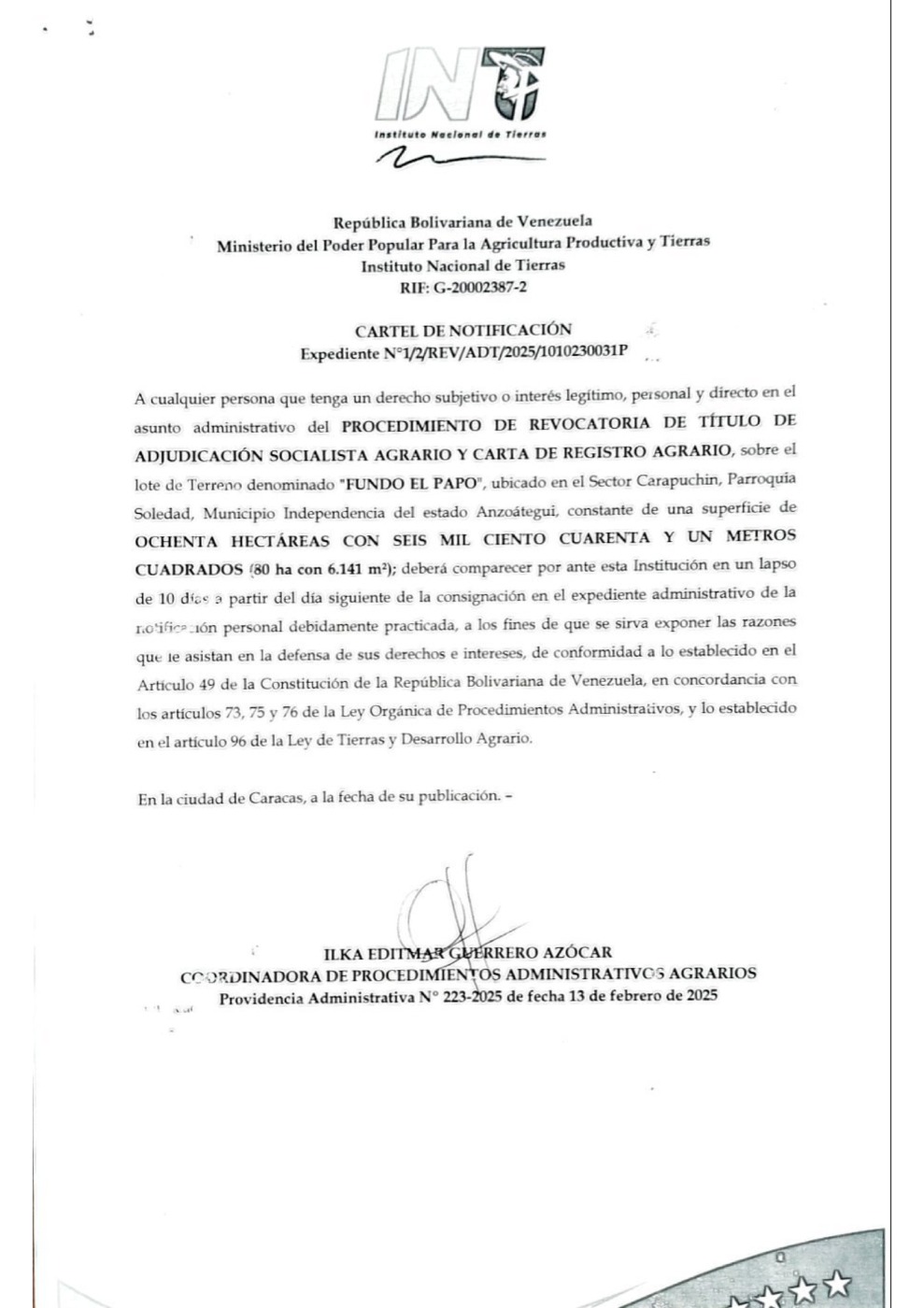 El INTI, Instituto Nacional de Tierras, emitió un Cartel de Notificación en relación al Procedimiento de Revocatoria de Título de Adjudicación Socialista Agrario y Carta de Registro Agrario, sobre el lote de terreno denominado «Fundo El Papo», ubicado en el sector Carapuchín, parroquia Soledad, municipio Independencia del estado Anzoátegui. El documento está suscrito por Ilka Guerrero Azócar, coordinadora de procedimientos administrativos agrarios.