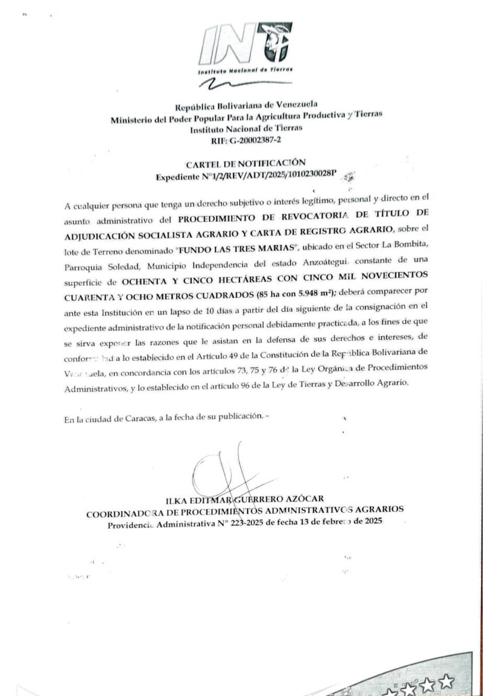 El INTI, Instituto Nacional de Tierras, emitió un Cartel de Notificación en relación al Procedimiento de Revocatoria de Título de Adjudicación Socialista Agrario y Carta de Registro Agrario, sobre el lote de terreno denominado «Fundo Las Tres Marías», ubicado en el sector La Bombita, parroquia Soledad, municipio Independencia del estado Anzoátegui. El documento está suscrito por Ilka Guerrero Azócar, coordinadora de procedimientos administrativos agrarios.