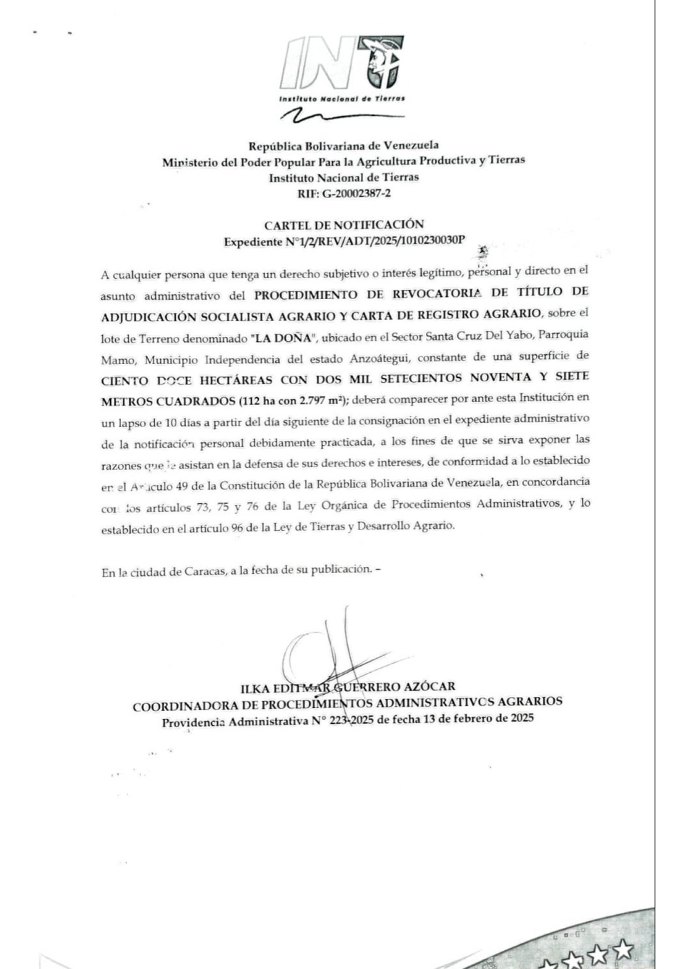 El INTI, Instituto Nacional de Tierras, emitió un Cartel de Notificación en relación al Procedimiento de Revocatoria de Título de Adjudicación Socialista Agrario y Carta de Registro Agrario, sobre el lote de terreno denominado «La Doña», ubicado en el sector Santa Cruz del Yabo, parroquia Mamo, municipio Independencia del estado Anzoátegui. El documento está suscrito por Ilka Guerrero Azócar, coordinadora de procedimientos administrativos agrarios.