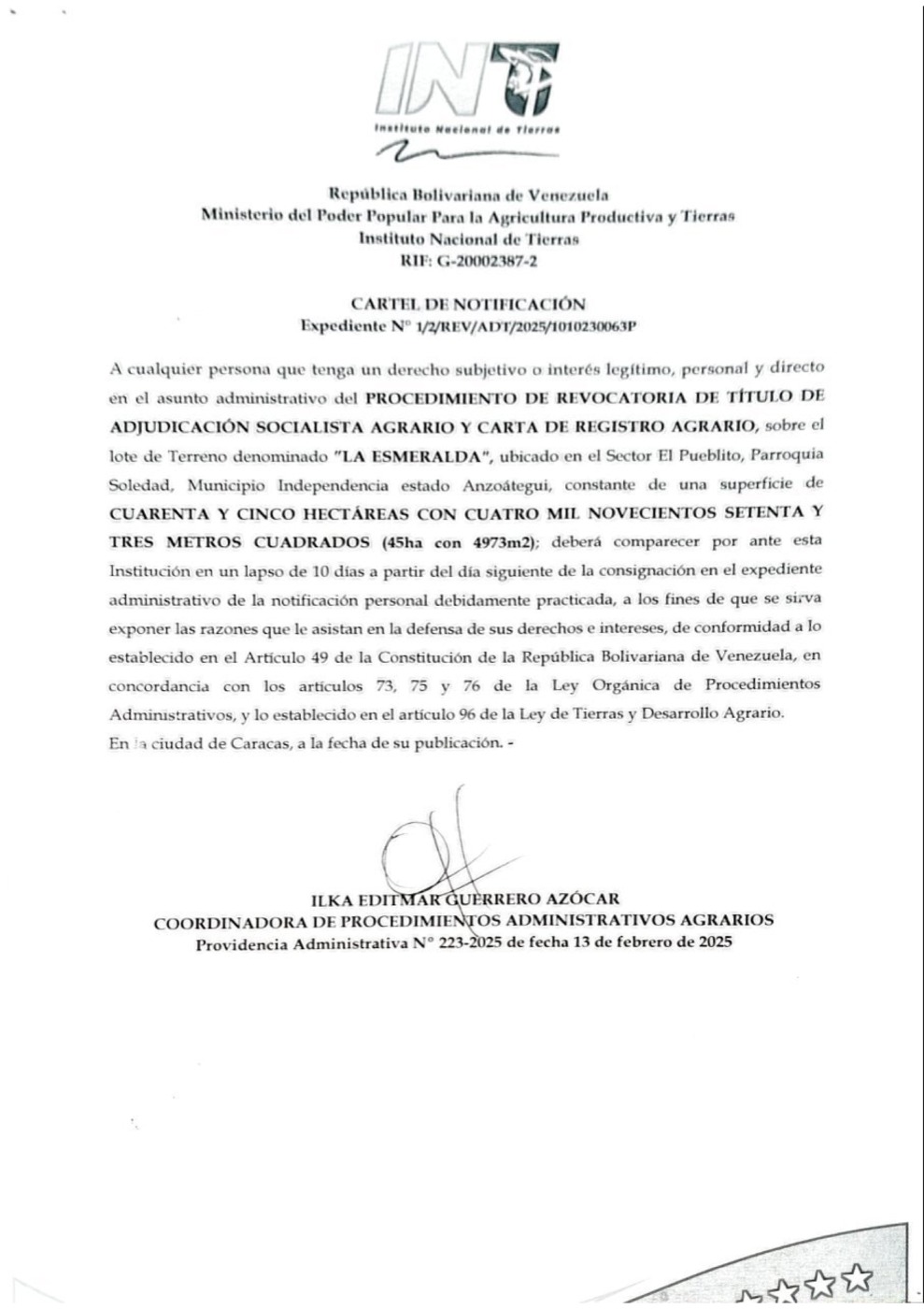 El INTI, Instituto Nacional de Tierras, emitió un Cartel de Notificación en relación al Procedimiento de Revocatoria de Título de Adjudicación Socialista Agrario y Carta de Registro Agrario, sobre el lote de terreno denominado «La Esmeralda», ubicado en el sector El Pueblito, parroquia Soledad, municipio Independencia del estado Anzoátegui. El documento está suscrito por Ilka Guerrero Azócar, coordinadora de procedimientos administrativos agrarios.