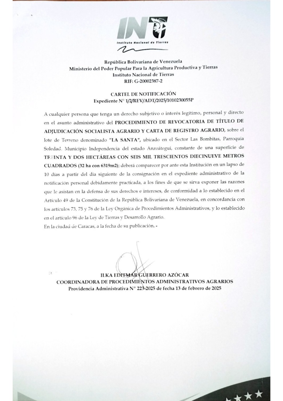 El INTI, Instituto Nacional de Tierras, emitió un Cartel de Notificación en relación al Procedimiento de Revocatoria de Título de Adjudicación Socialista Agrario y Carta de Registro Agrario, sobre el lote de terreno denominado «La Santa», ubicado en el sector Las Bombitas, parroquia Soledad, municipio Independencia del estado Anzoátegui. El documento está suscrito por Ilka Guerrero Azócar, coordinadora de procedimientos administrativos agrarios.