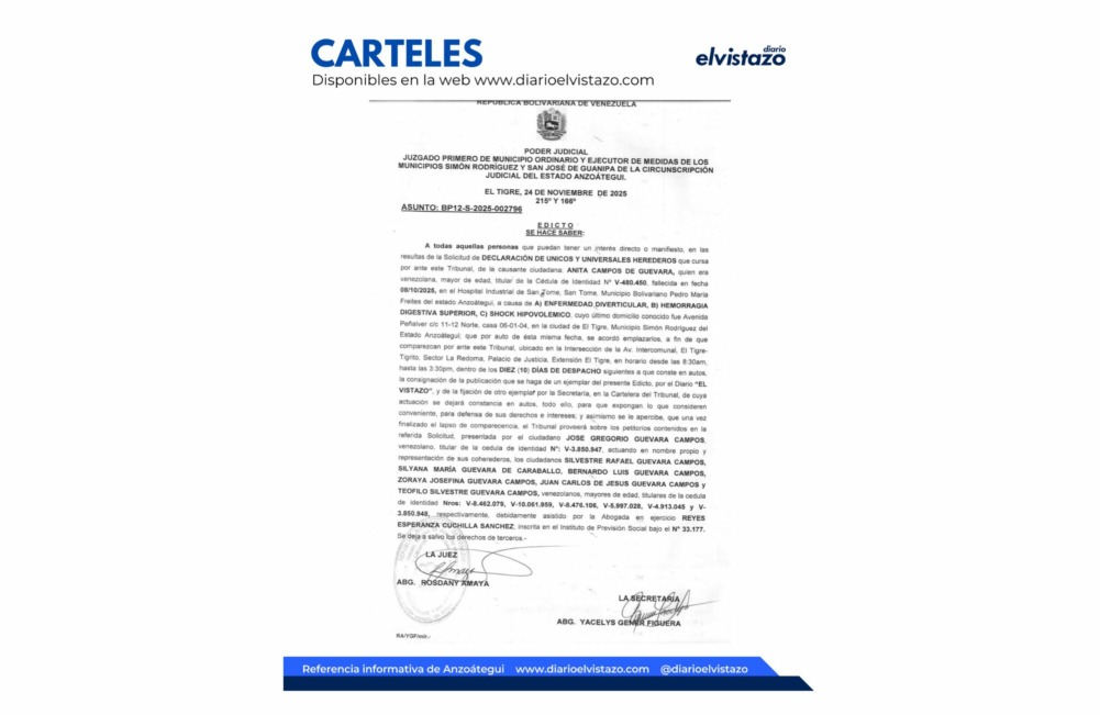 El INTI, Instituto Nacional de Tierras, emitió un Cartel de Notificación en relación al Procedimiento de Revocatoria de Título de Adjudicación Socialista Agrario y Carta de Registro Agrario, sobre el lote de terreno denominado «La Verdosa», ubicado en el sector La Canoa, parroquia Soledad, municipio Independencia del estado Anzoátegui. El documento está suscrito por Ilka Guerrero Azócar, coordinadora de procedimientos administrativos agrarios.