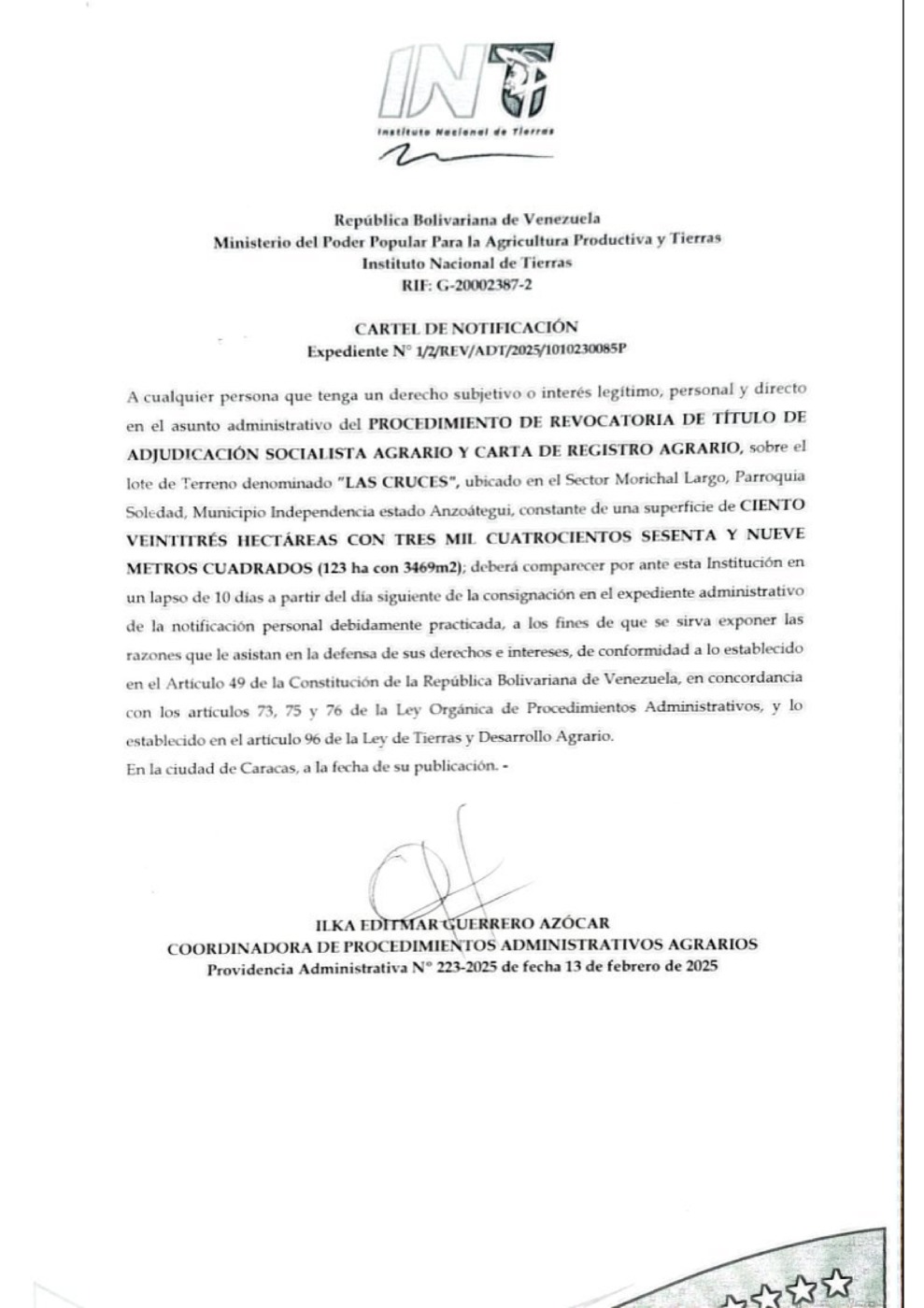 El INTI, Instituto Nacional de Tierras, emitió un Cartel de Notificación en relación al Procedimiento de Revocatoria de Título de Adjudicación Socialista Agrario y Carta de Registro Agrario, sobre el lote de terreno denominado «Las Cruces», ubicado en el sector Morichal Largo, parroquia Soledad, municipio Independencia del estado Anzoátegui. El documento está suscrito por Ilka Guerrero Azócar, coordinadora de procedimientos administrativos agrarios.